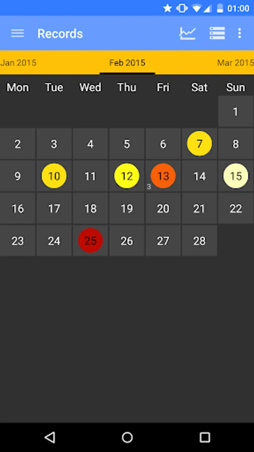 • View your headaches in a calendar view. Quickly and easily update, delete or add new headaches from the calendar view. The calendar view can be useful in finding patterns in headaches