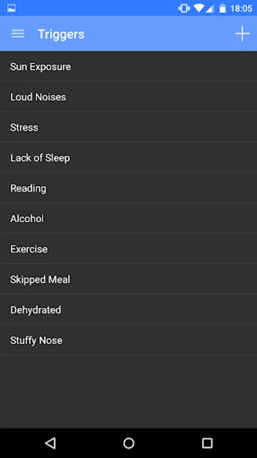 • Track the potential triggers of a headache such as stress, lack of sleep, loud noises, sunlight and many more. Custom triggers can be added as well