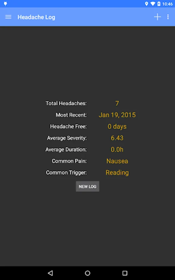 • View a variety of statistics about your headaches such as how many headaches have been recorded, how many days since your last headache, average severity, average duration, most common pains, locations and medications