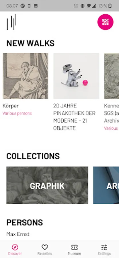 Choose out of our curated walks through the exhibitions or explore the richness of the Pinakothek der Moderne on your own. The integrated navigation guides you to the exhibit of your choice and provides you a new experience with the aid of text, audio and video. Scan the QR codes within an exhibition or search and favour exhibits to personalise your visit in the Pinakothek der Moderne.