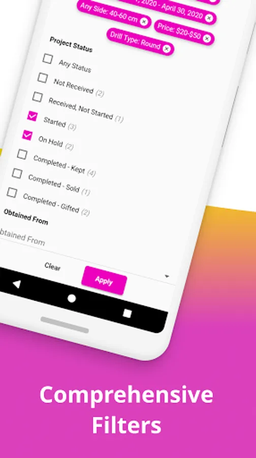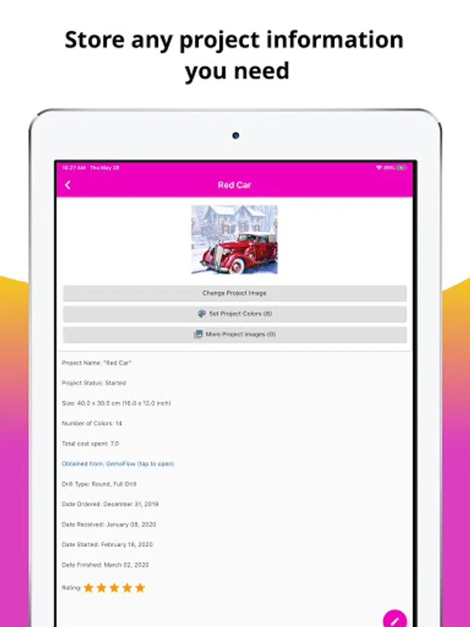 - Supported Project’s Information: Name, Canvas Size, Cost, Drill type, Date, Project status, Notes, Rating, Used Colors.
