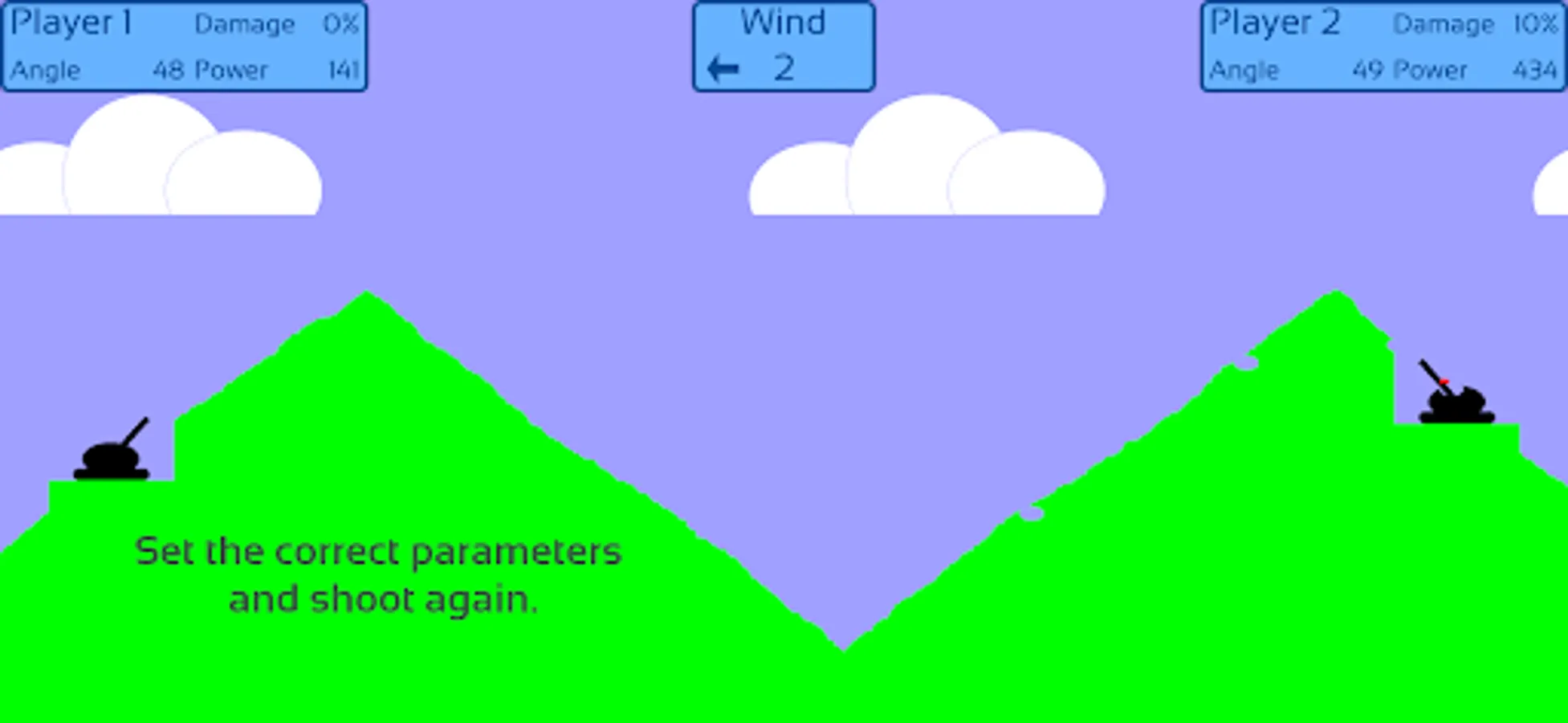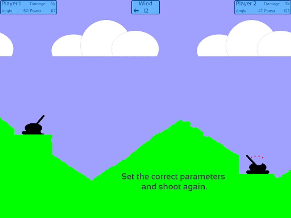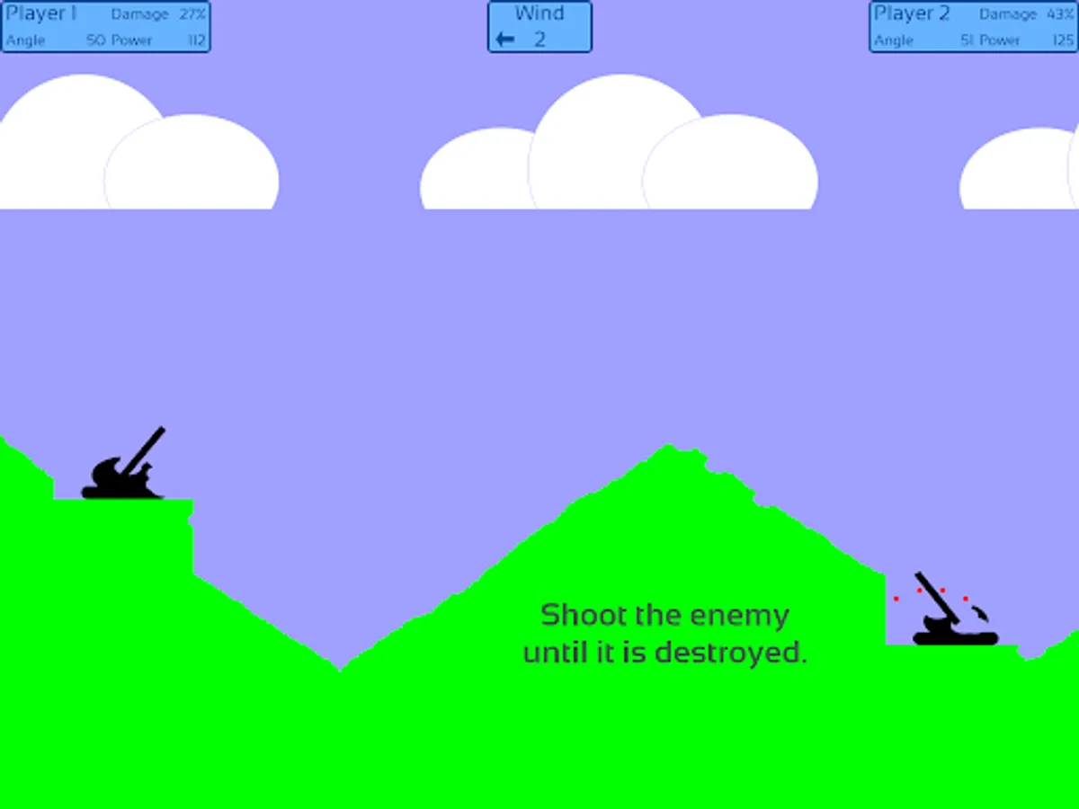 Artillery Duel is a classic and simple strategy game that can be played between human - human and human - machine player. The goal is to destroy the enemy tank. The events take place in a two-dimensional mountainous terrain. The first player's tank is on the left and the second player's is on the right. They have to take turns shooting at each other. There are three difficulty levels to choose from when one of the players is the machine.