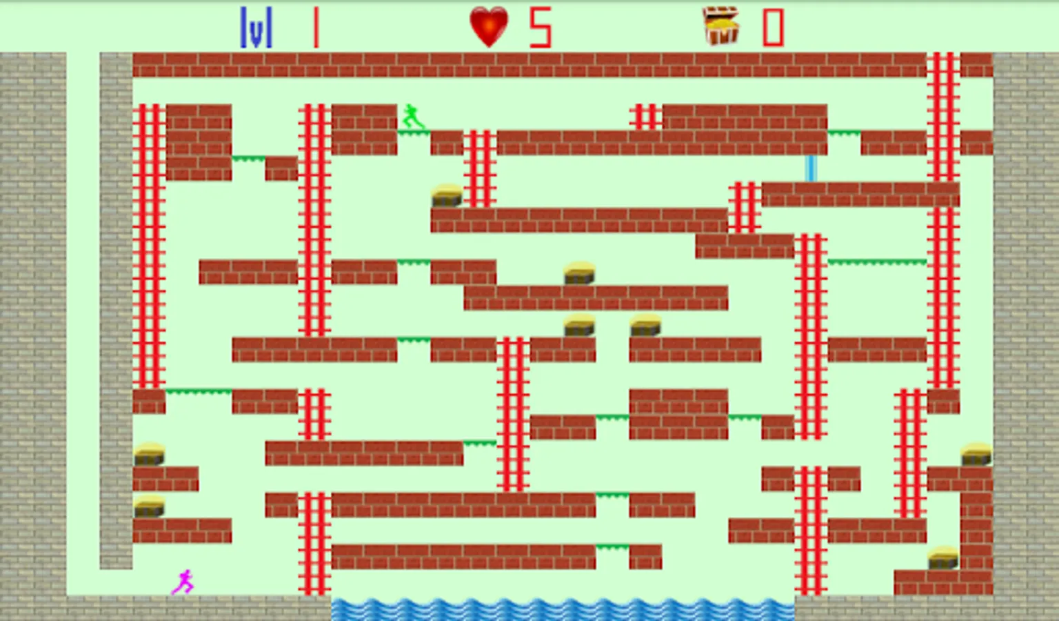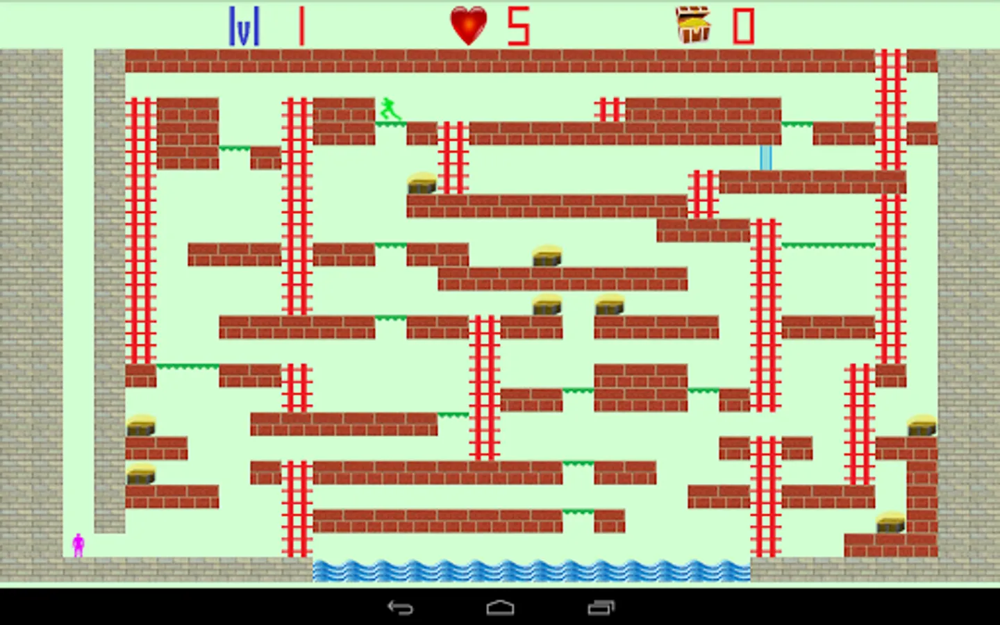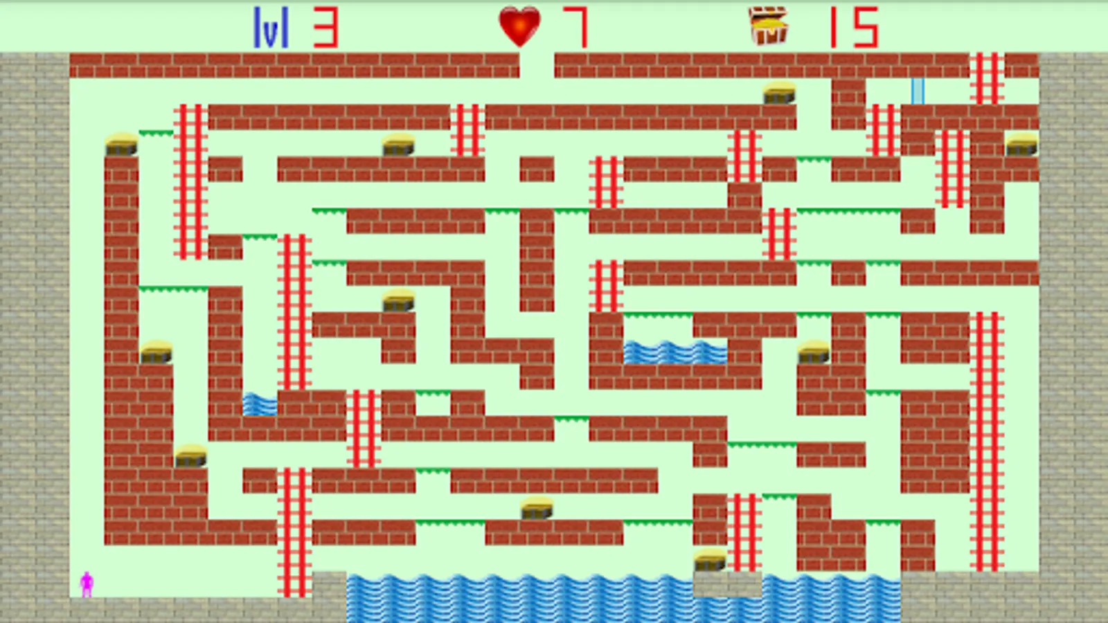 The goal is to pass all 80 labyrinths, collecting all the treasure chests and avoid encounters with the green men, do not fall into the water.