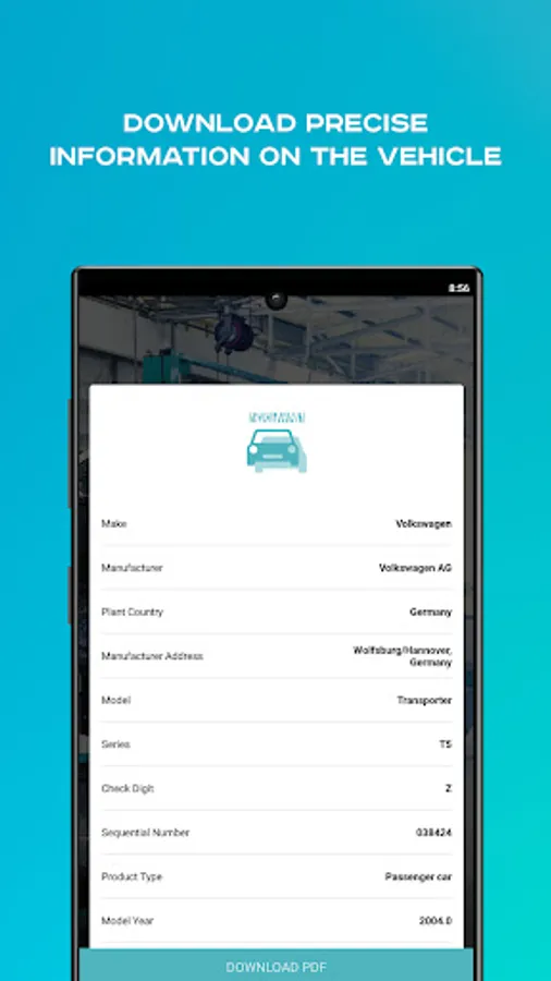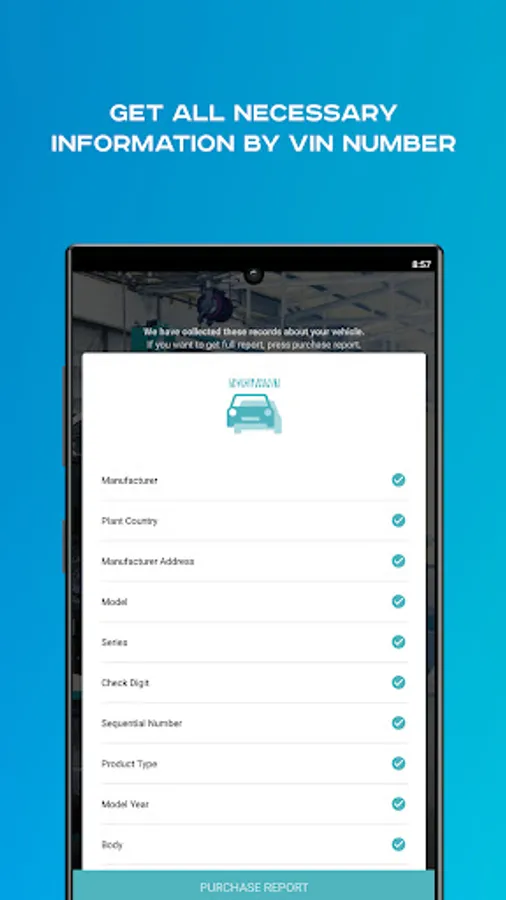 With Easy VIN Check you can quickly get all necessary information about the vehicle simply using a VIN number. The check will include mileage history, manufacturer, color, estimated market value, dimensions, vehicle type, wheel size and more. You will get a summary report, where you can see which information is available before purchasing a FULL report.