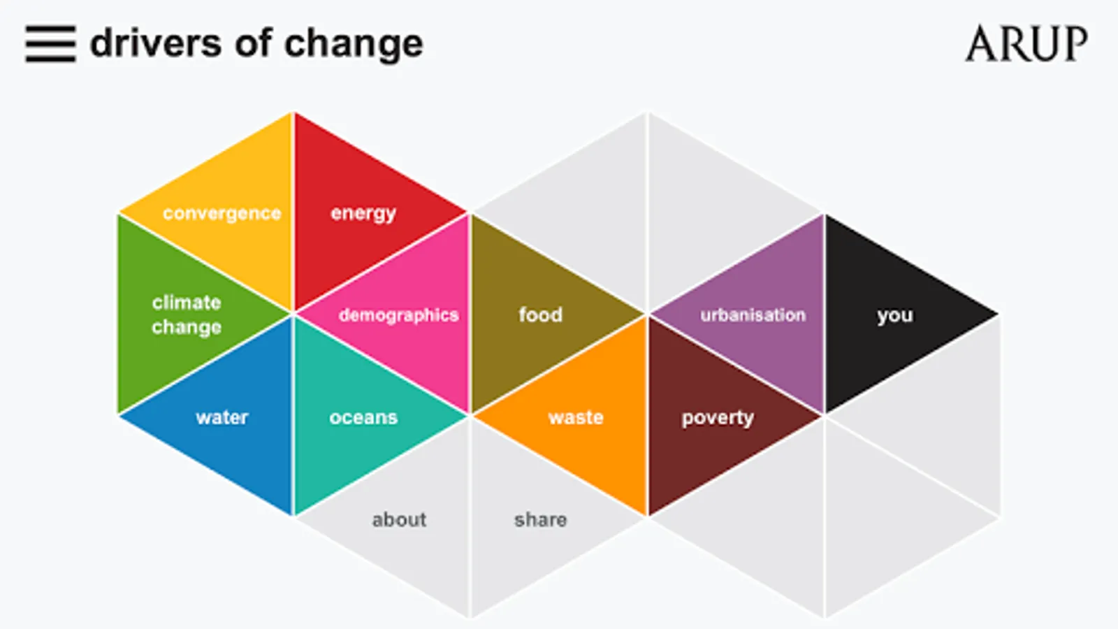 The Drivers of Change app is informed by a very rigorous process of interviews, research and workshop analysis alongside input from Arup’s global network and broad spectrum of experts.