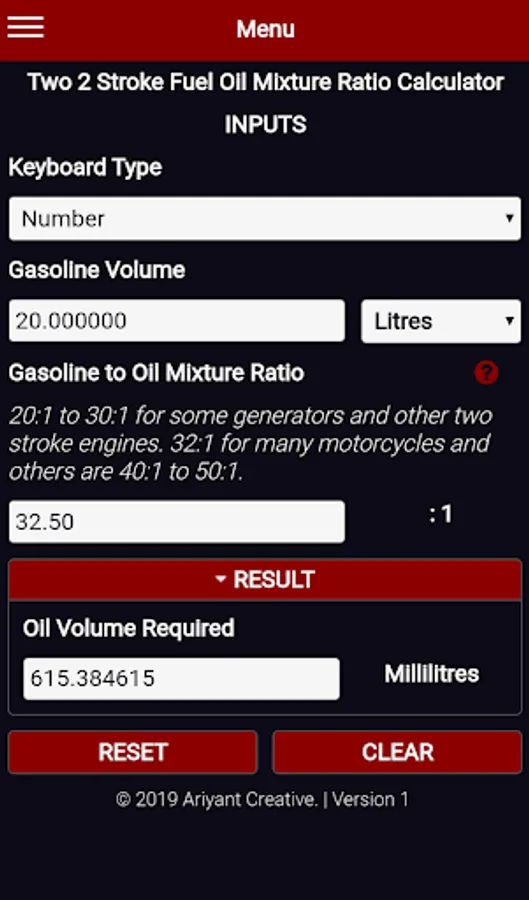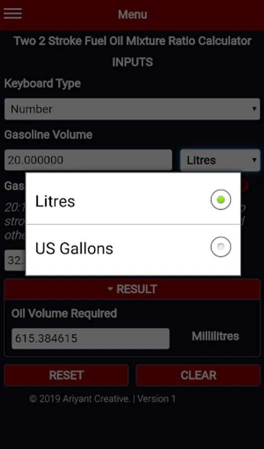 Two 2 Stroke Fuel Gasoline Gas Oil Mixture Ratio Calculator PRO. Inputs in US Gallons and Litres type. Results in US Ounces and Millilitres type.