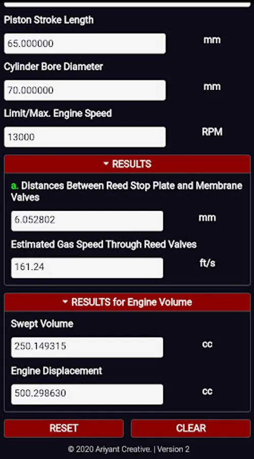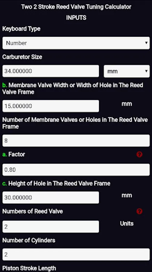 Two 2 Stroke Reed Valve Tuning Calculator. This app for finding an ideal of Distance Between Reed Stop Plate and Membrane Valve and Estimated Gas Speed Through Reed Valve.
