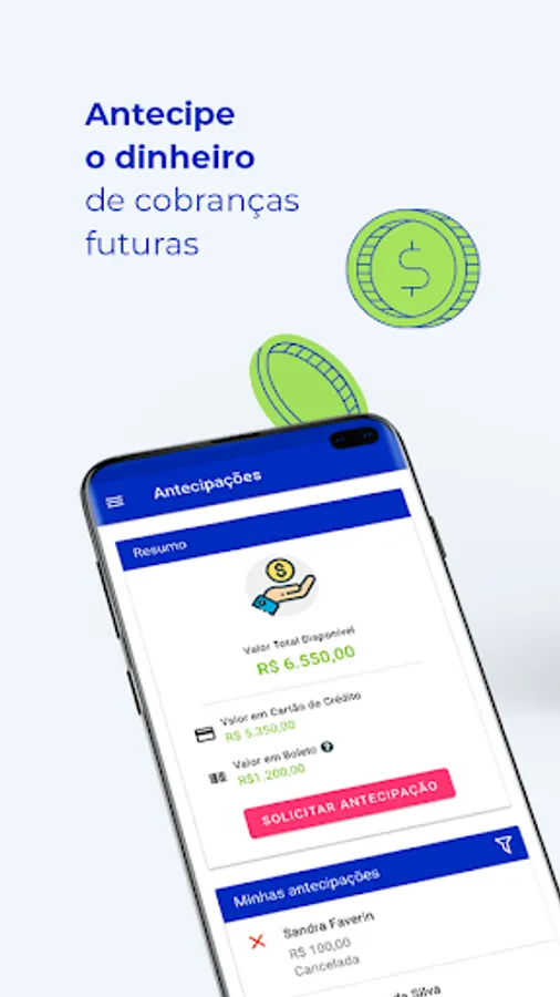 Anticipate the money for future charges via bank slip or credit card and optimize your cash flow!
