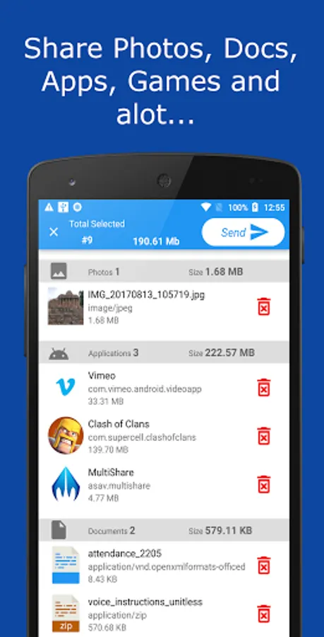 ShareIt - As name specifing, ShareIt allows you to share files, apps, games, video and much more among multiple devices in one go. Just select videos, photos, music, apps, pdf, zip, documents files or anything, then decide weather you want to send them to one friend or all friends to whom you allow(PC, Macbook) with fast transfer rate.