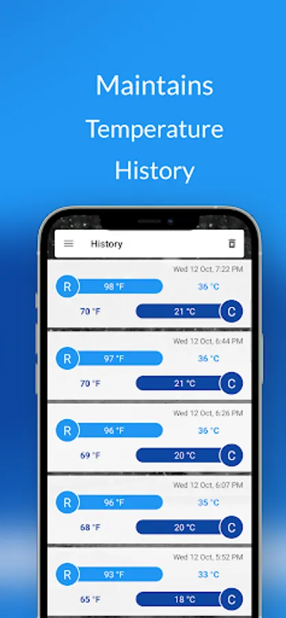 Both indoor temperature and outdoor temperature supports results in Celsius °C, Fahrenheit °F, Kelvin K inside temperature scanner app