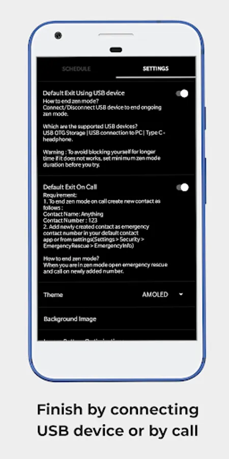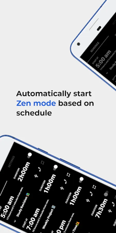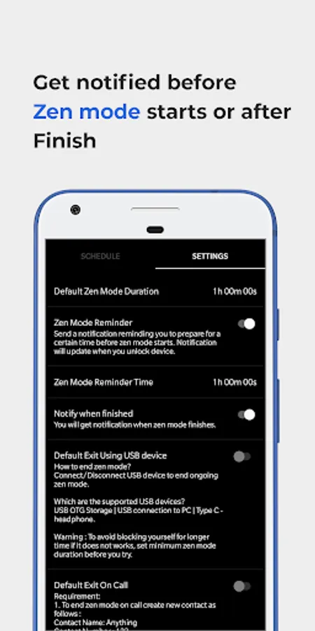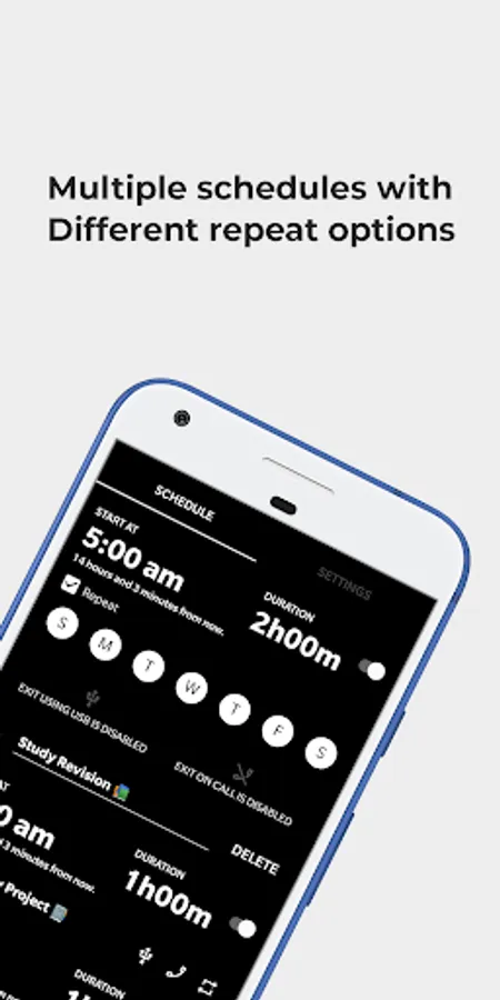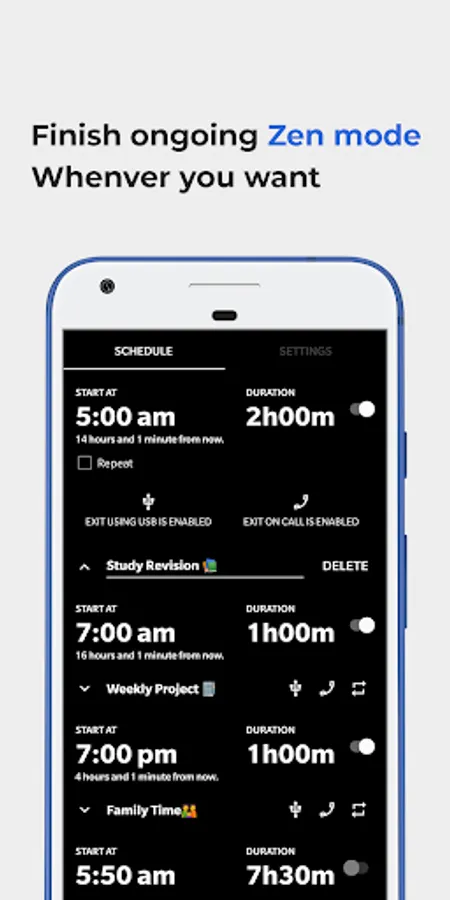 It's so versatile and flexible that you can set schedules as many as you want and each schedule can be customized for different scheduling options like repeat daily, weekly or on any specific week day, set custom zen mode duration(not only 20 min, 30 min, 40 min or 60 min) finish ongoing zen mode by connecting USB or by calling on number(123) or at specific time.