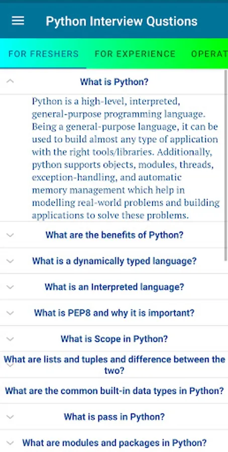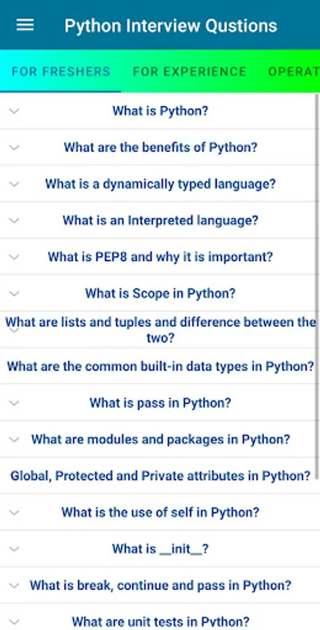 This app is intended for Python software developers over the world. It is helpful not only for job interview situations, but also for refreshing many aspects of Python programming language during normal working schedule.