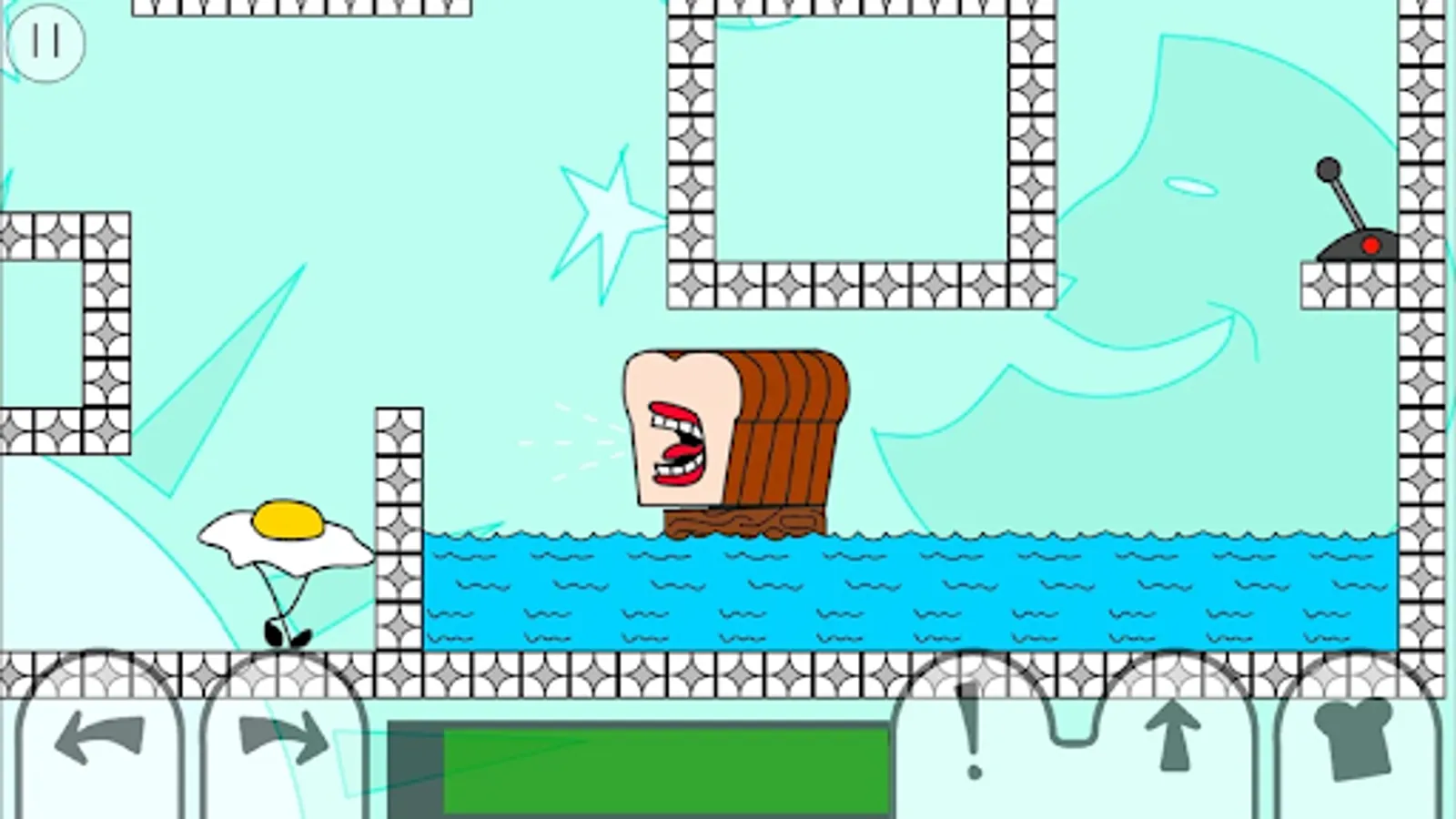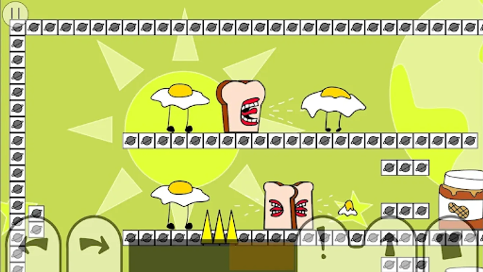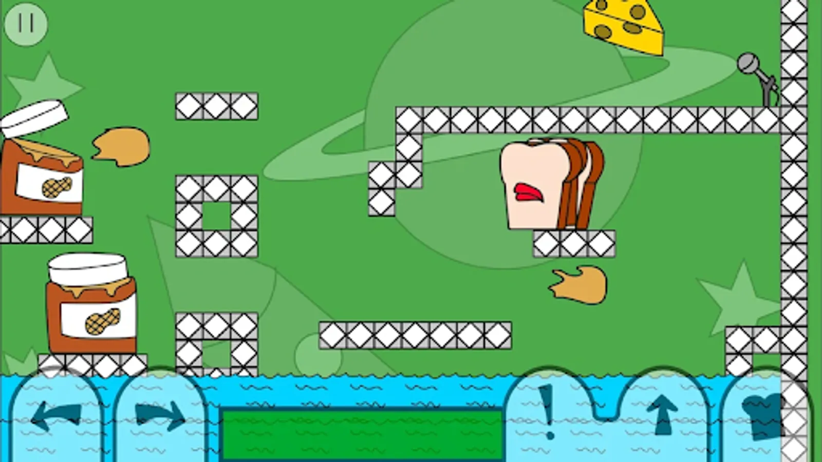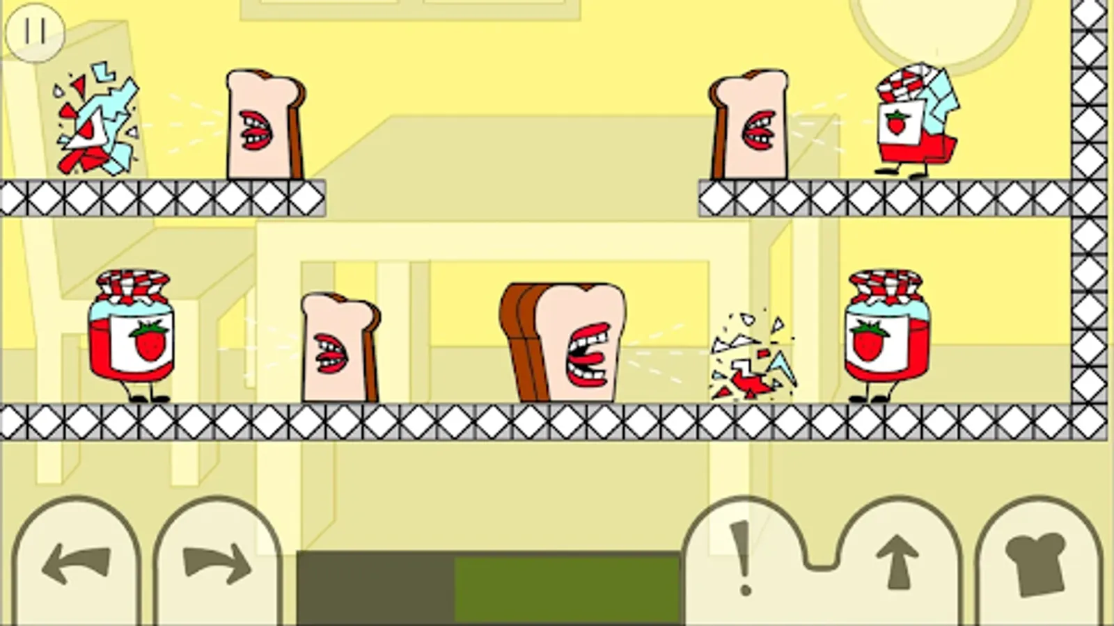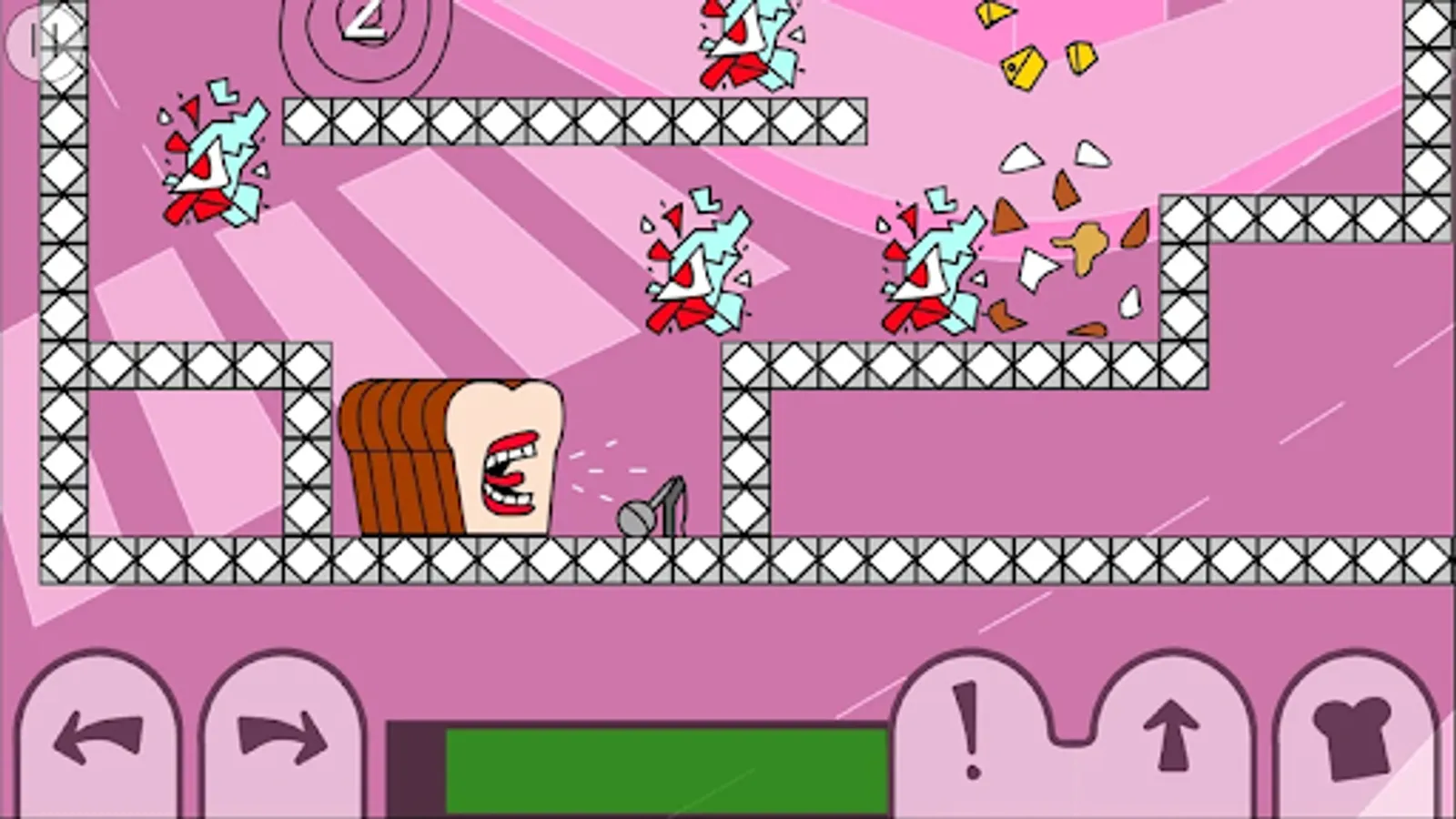 Each level has you control Loaf with the objective to destroy all enemies. There are 5 on-screen buttons; move left, move right, scream, jump, and drop a slice. Different enemies have different strengths, so some may require prolonged screaming to eliminate. Screaming is not only good for damaging enemies, Loaf's scream can also propel himself across water, push levers, inflate balloons, and more. Loaf is made up of 5 bread slices, Loaf has the ability to drop slices off his back and re-join with them later, any dropped slices will scream at the same time. More points are scored for completing levels quickly, so dropping slices next to where enemies are about to spawn is useful to defeat them more efficiently. Figuring out where to drop slices plays a big part in the game's puzzle solving. Slices also act as health, a slice is lost from Loaf upon enemy collision. Beware though, each slice you drop gives Loaf one less slice of protection. You will fail and have to retry the level if you lose your front slice.