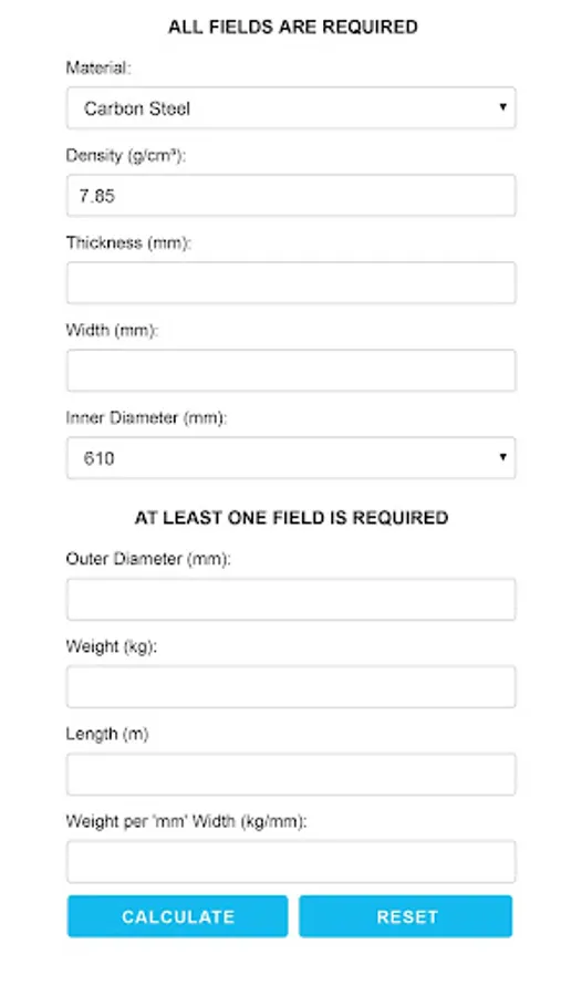 The "Steel Coil Calculator" App is designed to help you quickly and easily determine common coil sizes based on your specific requirements. This calculator provides a estimate of possible coil weight and strip length.