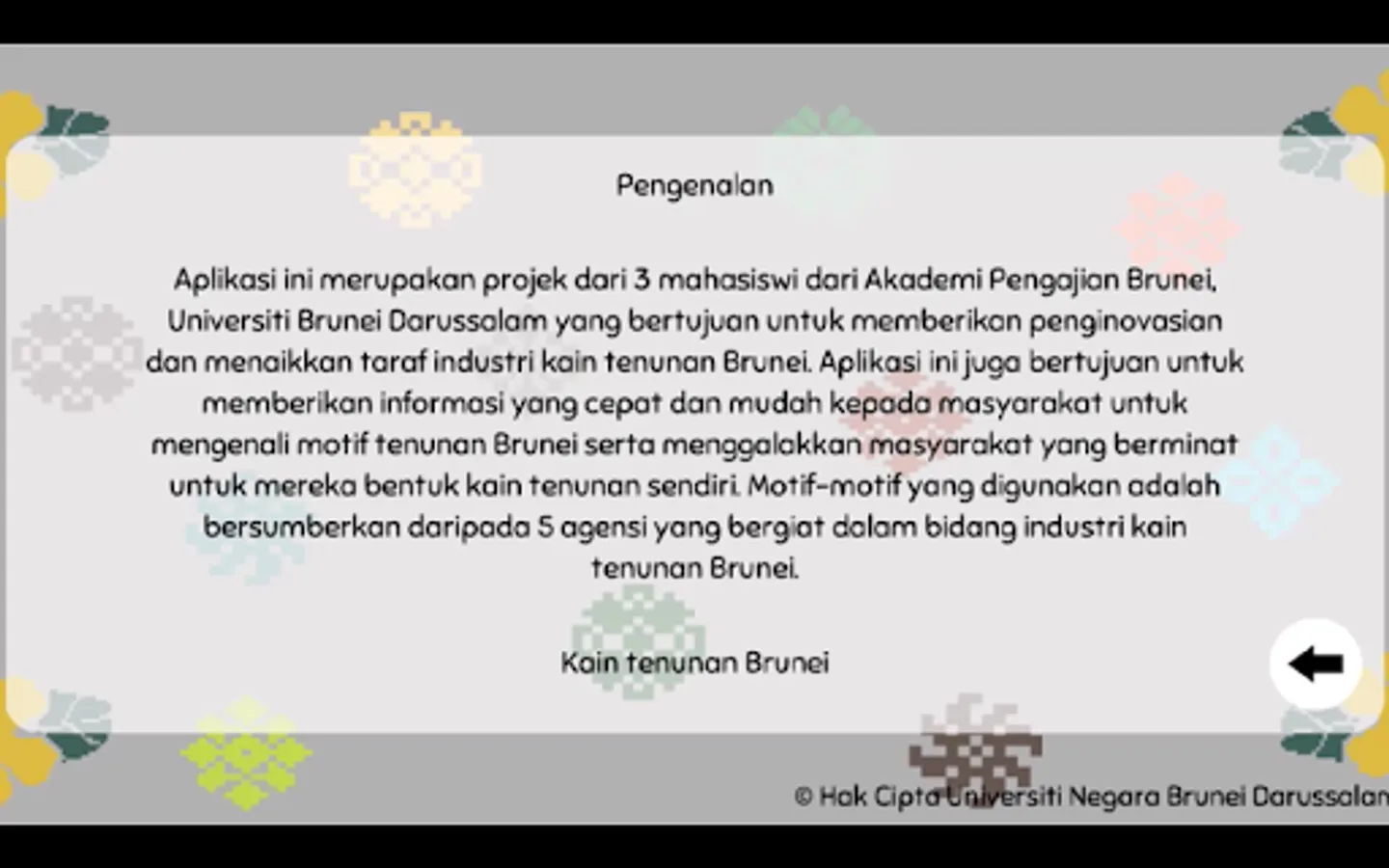 This application is a project of 3 female students from the Brunei Academy of Education, Universiti Brunei Darussalam which aims to provide the process of upgrading and upgrading the Brunei woven cloth industry. The application also aims to provide quick and easy information to the public to recognize Brunei's weave motifs and encourage people who are interested in designing their own woven fabrics. The motives used are sourced from 5 agencies engaged in the field of Brunei's woven cloth industry.
