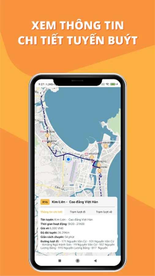 View detailed bus route information: bus route on a map, show online buses running on bus routes, list of stops on the route by turn, return, fare information for each route, route distance, route list in bus route.