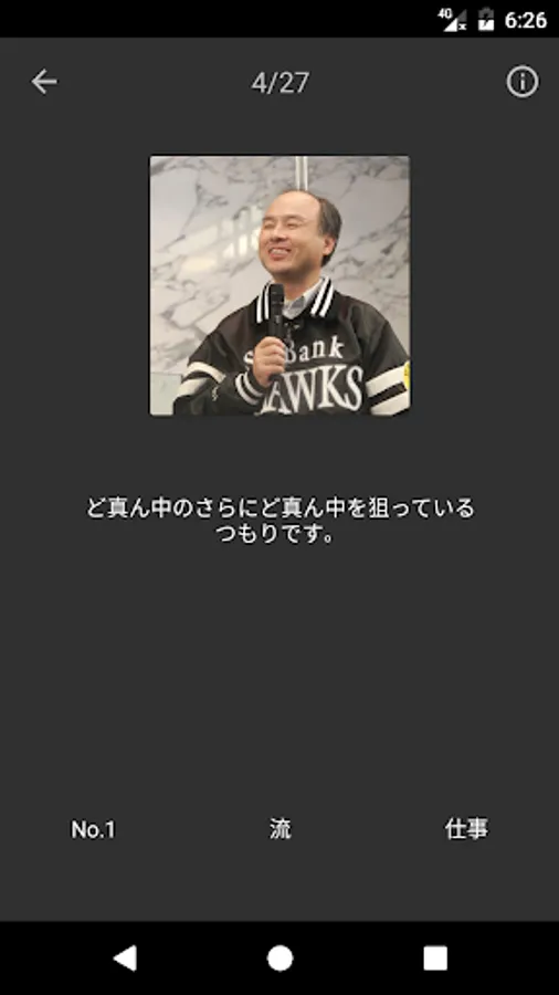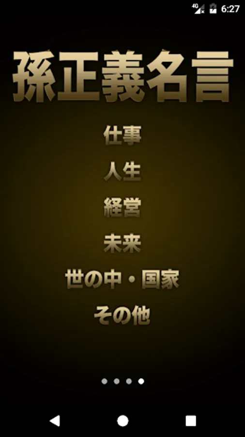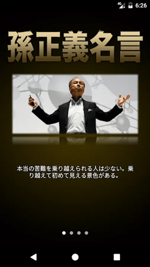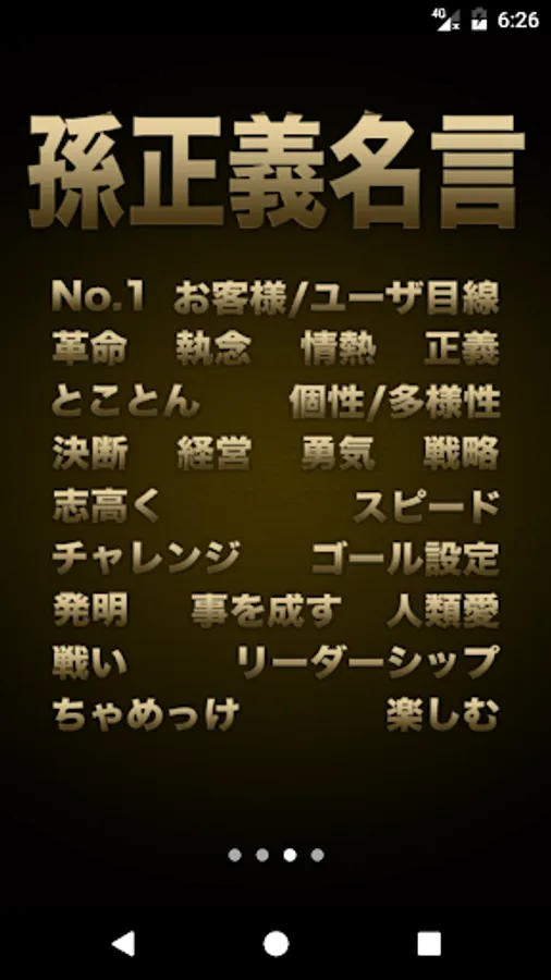 This application contains all wise sayings which were tweeted on Twitter, said in Lecture of SoftBank Academia, stockholders’ meeting, financial settlement briefing, the press conference, etc. by Masayoshi Son. They are all selected carefully. There are various kinds of saying such as Mr. Son’s ambition, management philosophy and business approach, procedure of business, and also vie of life.