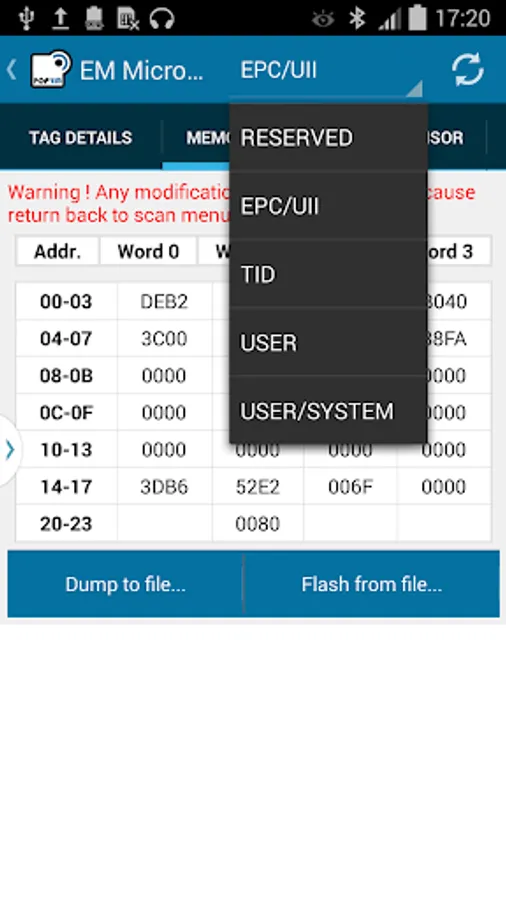 2) An Advanced tag information are available by touching any inventoried EPC code. The new windows which will pop up are depending on the selected IC. If the EM4325 is in the field and selected for advanced information, the tabs are: