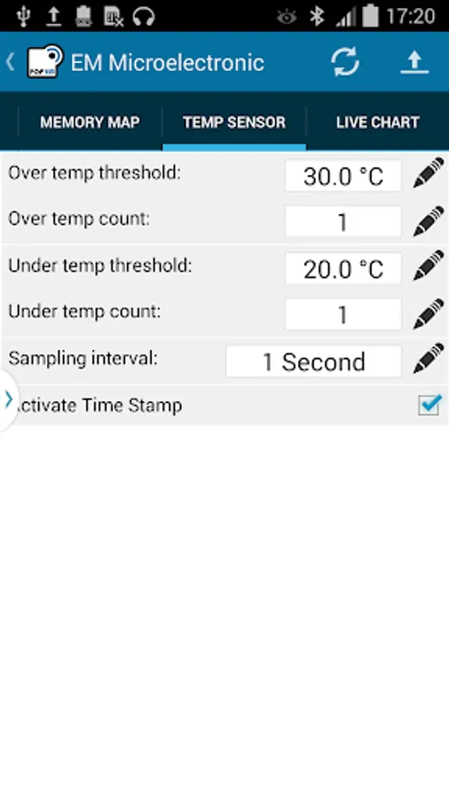 d. "Live Chart" to stream with the UHF dongle the BAP temperature monitoring in a chart view