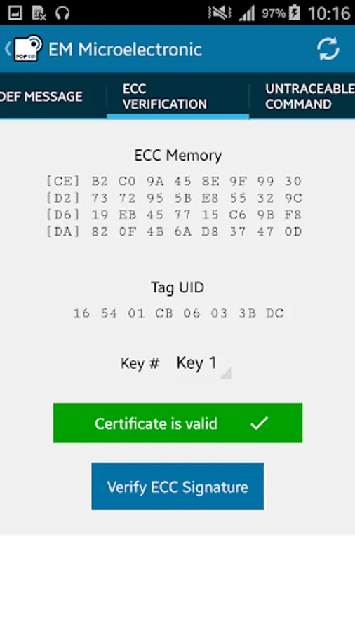 d. "ECC Verification" to check the digital signature contained in the tag memory.