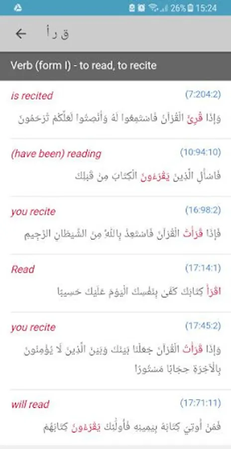This app aims to simplify the analysis of the words used in the Quran. The contextual meaning of the words is given in English for their various stems and forms along with the verse of the Quran in which it appears.