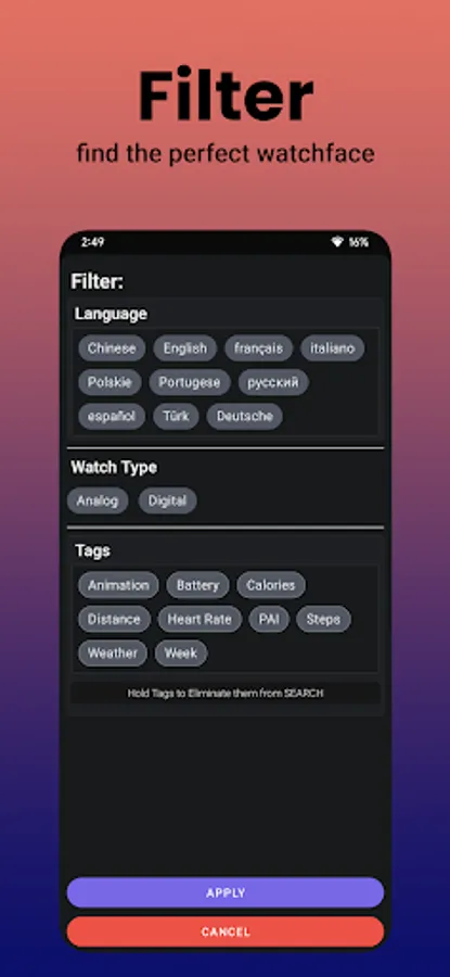 You can also filter on Animation, Battery, Calories, date, Distance, Pulse, Steps, Weather!