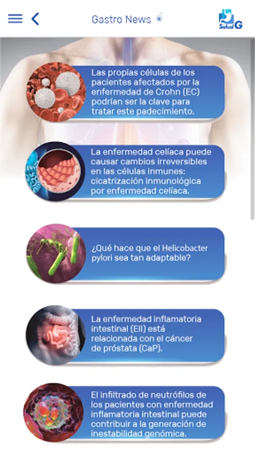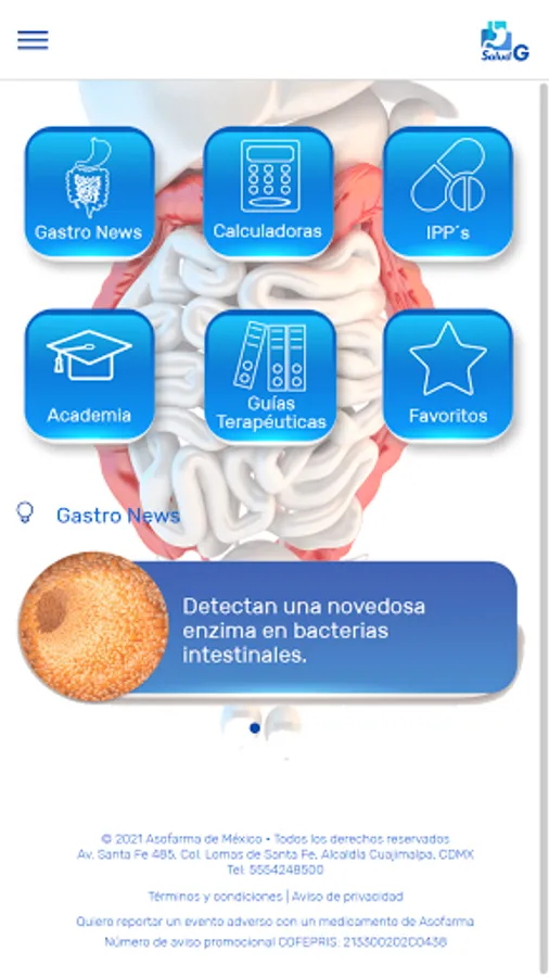 SaludG, where you can find relevant information on gastroenterology conditions that will support you during your medical practice, in which you will find therapeutic guides, medical calculators, gastro news, virtual continuing medical education courses and information on the different alternatives that Asofarma has for the treatment in gastrointestinal disorders.