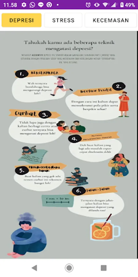 Users will also get information about mental health and will get information about techniques to deal with mental health problems that they experience, namely in the form of several relaxation techniques that can be applied to reduce and reduce the stress, anxiety and depression they experience.
