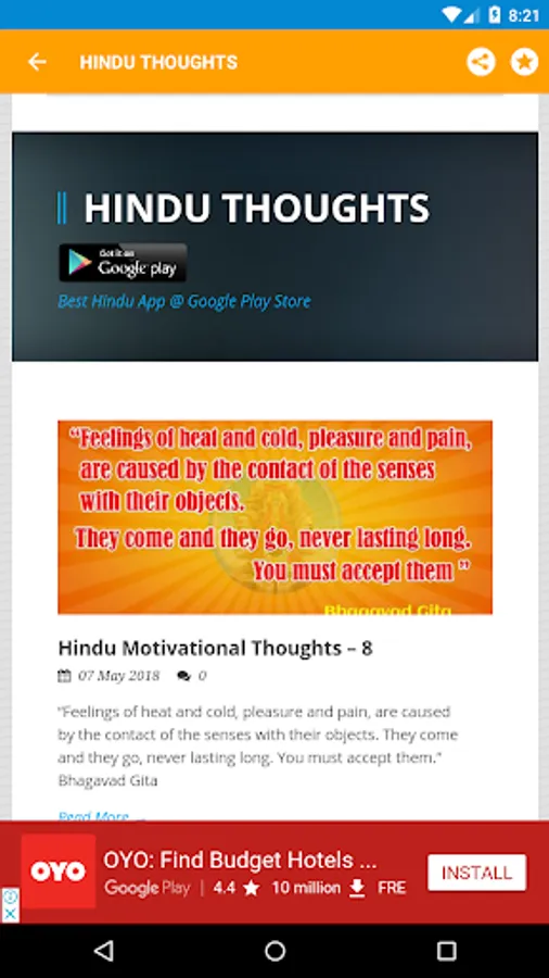 Hindu App Contains Ramayana Verses, Mahabharata Thoughts,Wallpapers,Hindu Prayers,Songs and Videos etc.You can share and download hindu thoughts and music’s from our app in different languages. Every day we added new contents and you have option to add this content to your favourite page in app itself. As a result you can easily find your funny content easily.