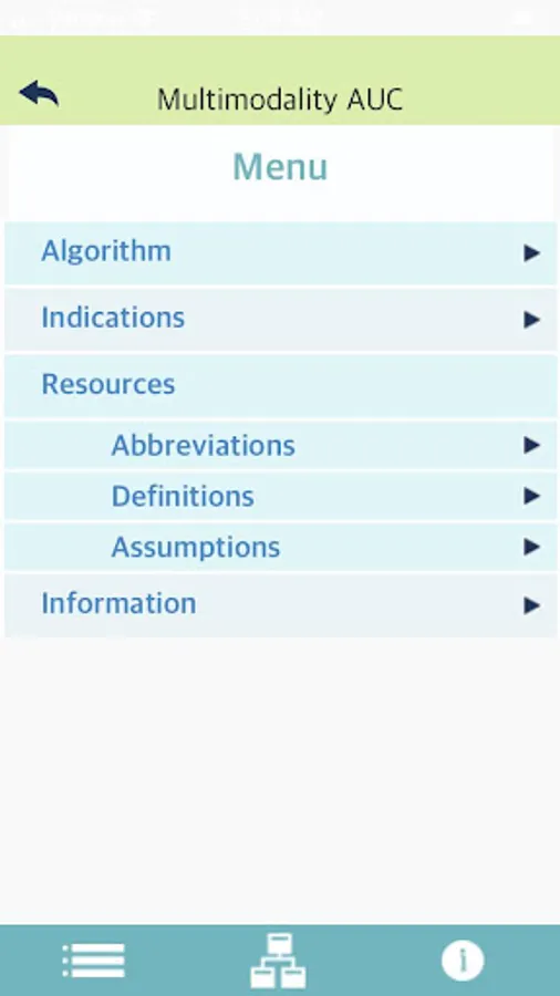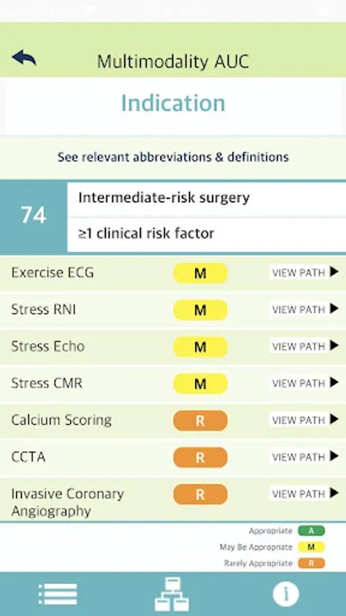 The Multimodality AUC App is not intended to diagnose, treat, or prevent any disease or condition. It is also not aqualified Clinical Decision Support Mechanism (CDSM), as defined by the Centers for Medicare & Medicaid Services (CMS). Thus, the Multimodality AUC App must not be used to try and comply with the CMS Appropriate Use Criteria (AUC) program requirements. The Multimodality AUC App is for informational purposes only.Nothing herein should be construed as medical, legal, or other professional advice or opinion.
