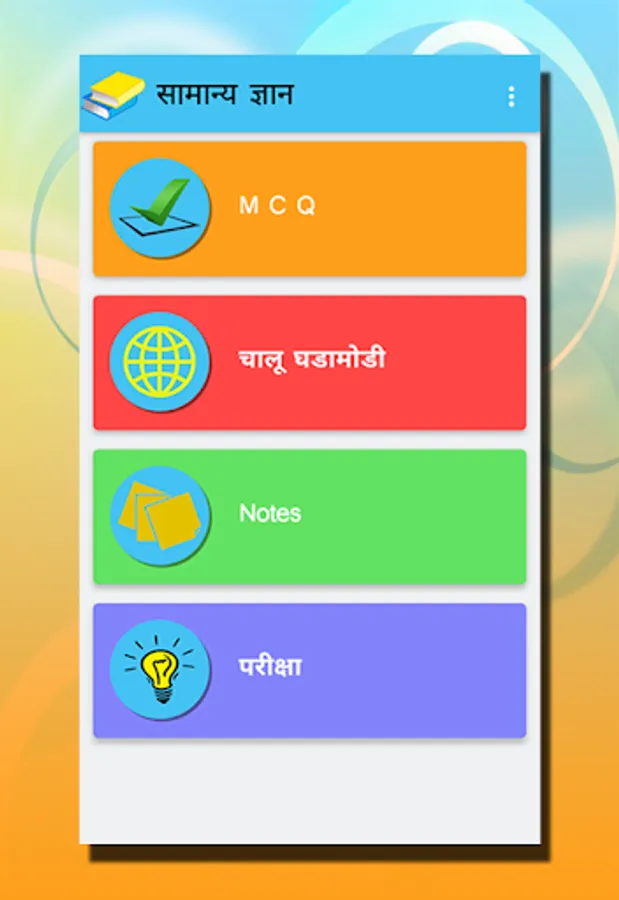 Marathi GK & Current Affairs (सामान्य ज्ञान & चालू घडामोडी ) application provides many general knowledge and Current Affairs topics (Notes & MCQ) for competitive exam preparation in Marathi Language.