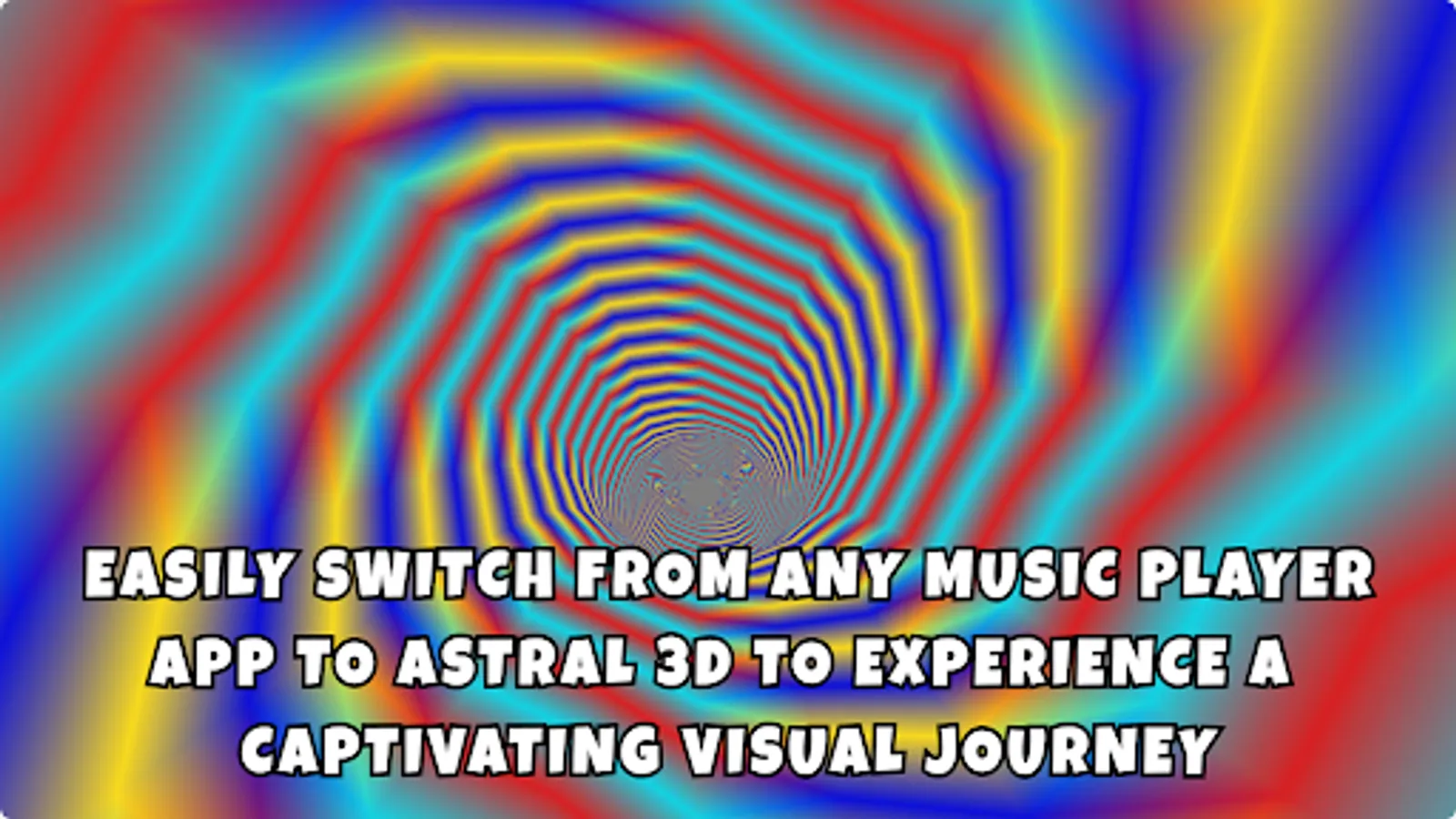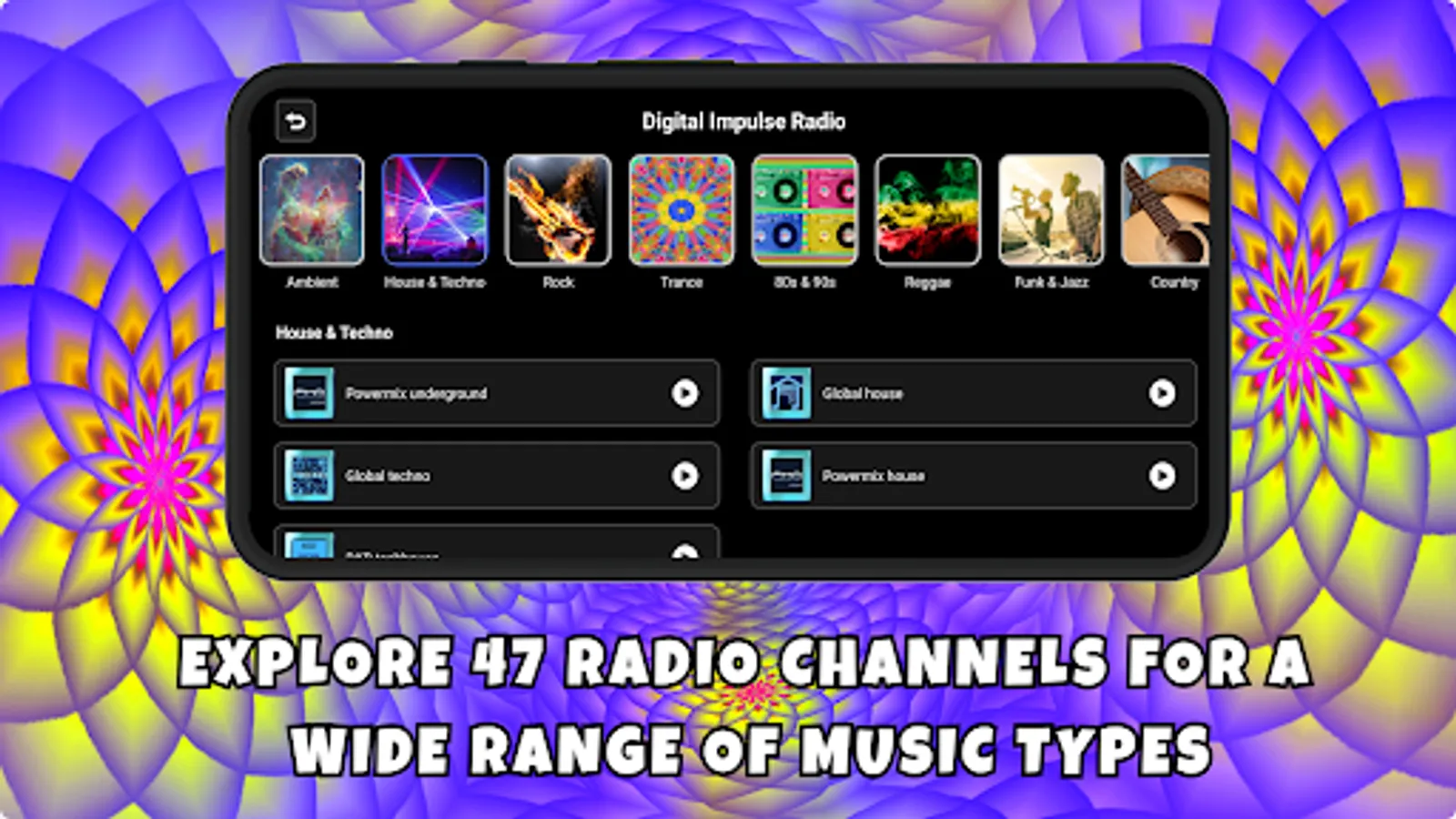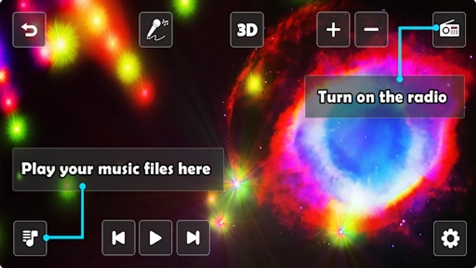 Play your music with any music player app. Then switch to this app. It will then visualize the music. Many radio channels are also available with music styles like house, ambient, techno, rock, trance and disco. A player for your music files is also included.