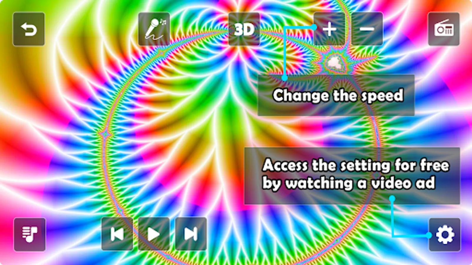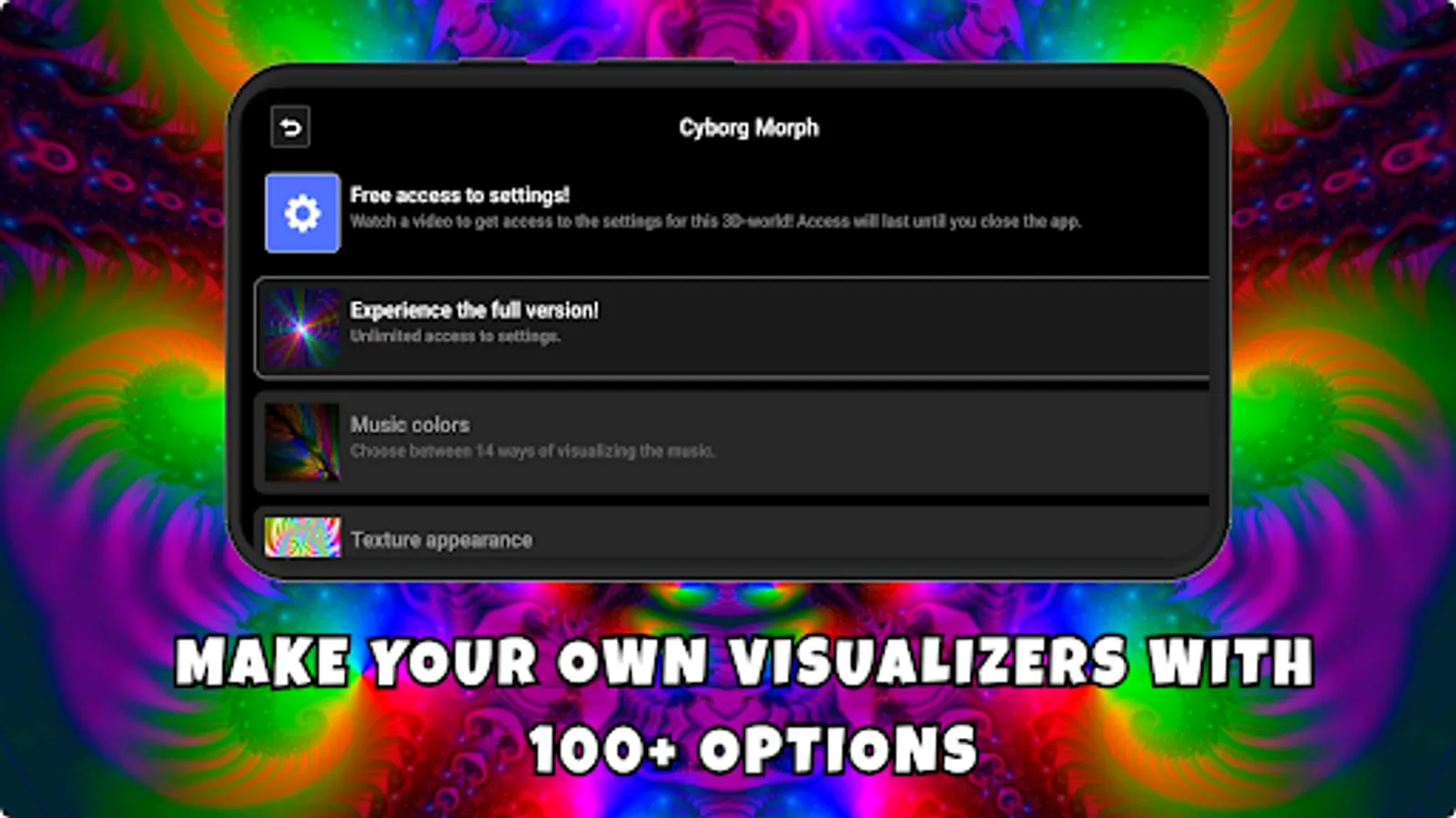 You can adjust the visualizers according to your taste with over 100 settings. You can change their appearance, so they look like your own creations. Get access to the settings in a simple way by watching video ads. This access will last until you close down the app.