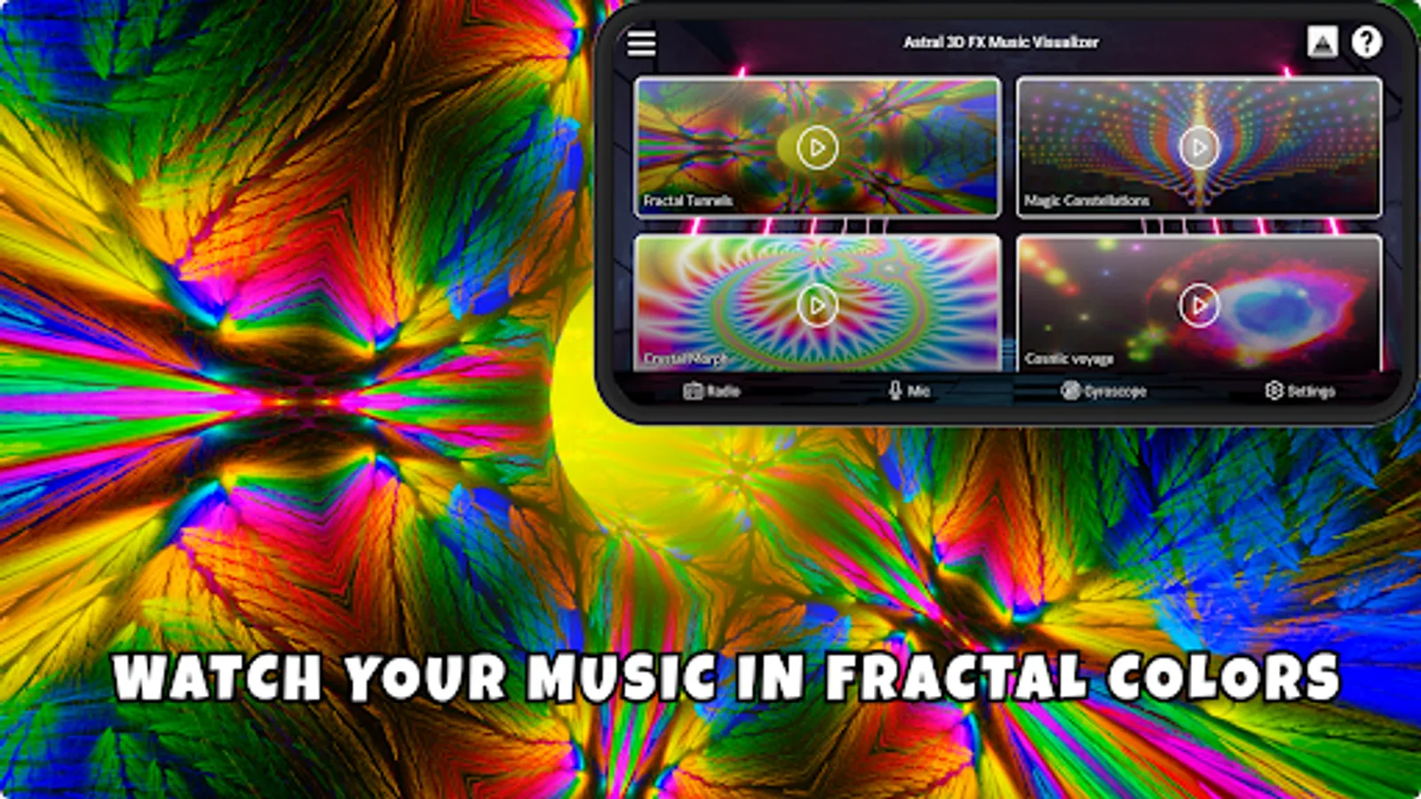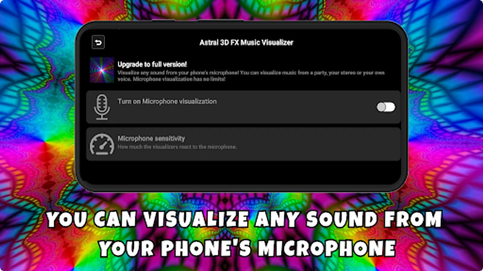 You can visualize any sound from your phone's Microphone. Visualize your voice, music from your stereo or from a party. Microphone visualization has no limits!