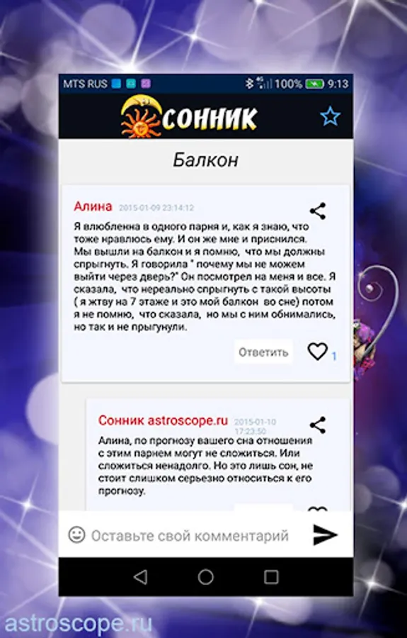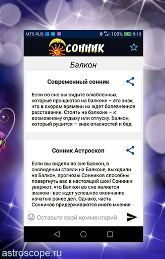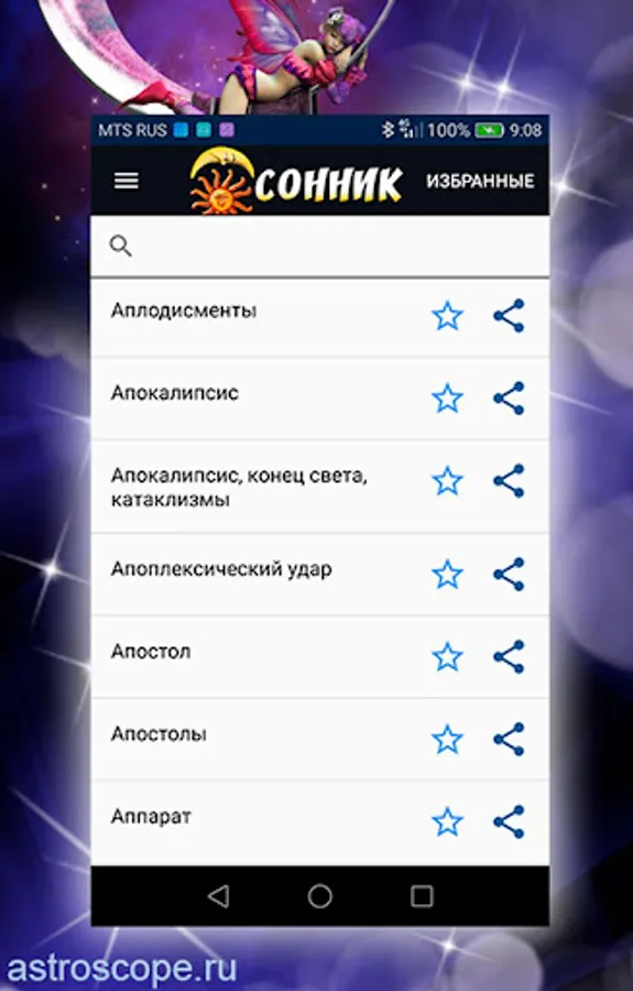 Dream Interpretation - is a free application that contains the interpretation of dreams which is an integral part of the dream-book portal Astroscope.RU Interpretation of Dreams is presented in annex as a dream book in Russian without having to connect the Internet (offline). The application includes an easy search by keyword's dream in a dream. You can also add to the page of interest to sleep interpretation, examples of dreams and comments to them, to make it easier to navigate in the application the next time you visit.