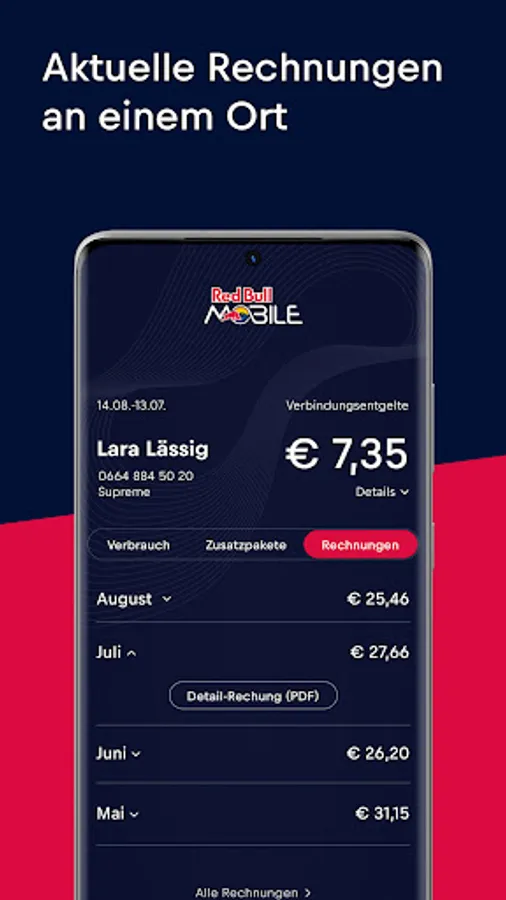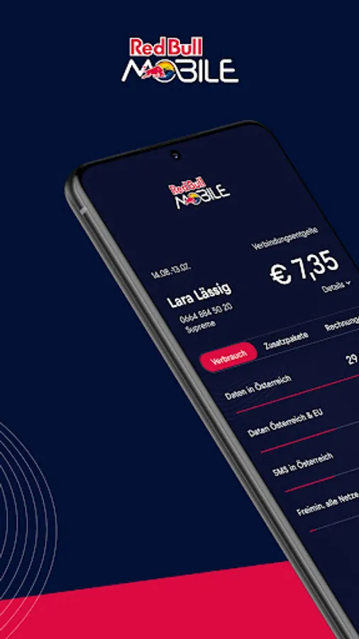 The Red Bull MOBILE app shows you the most important information about your mobile and internet tariff and allows you to make a large number of settings yourself.