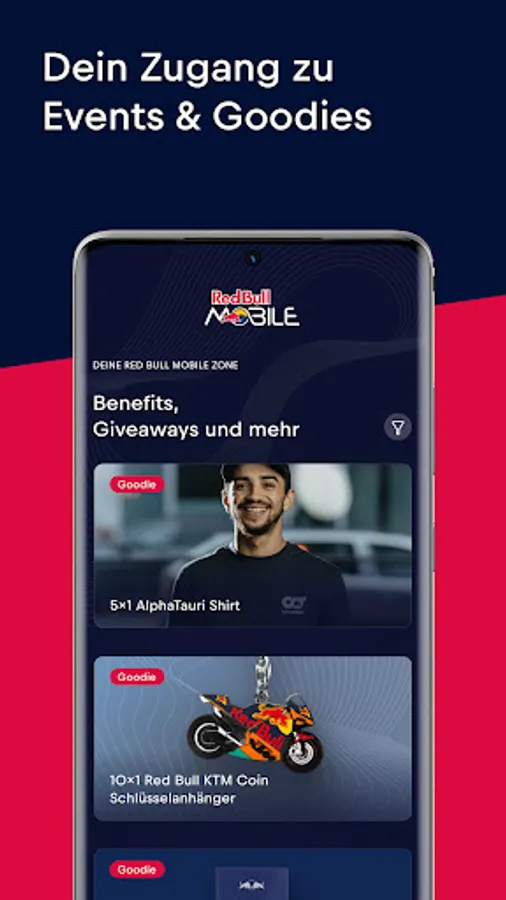 Immerse yourself in the world of Red Bull: The Red Bull MOBILE app gives you quick and easy access to the Red Bull MOBILE Zone. Event tickets, exclusive experiences, goodies from the Red Bull Fan Shop and much more await you there!