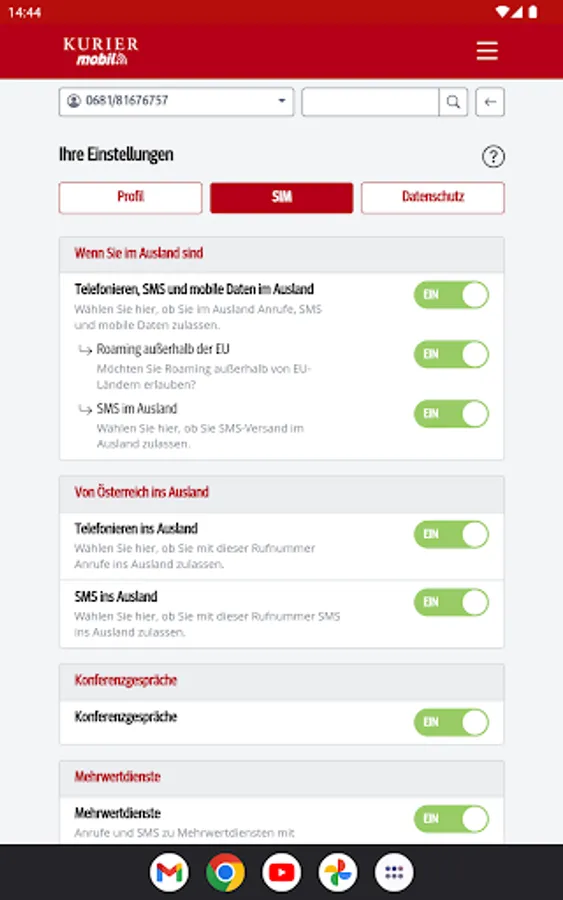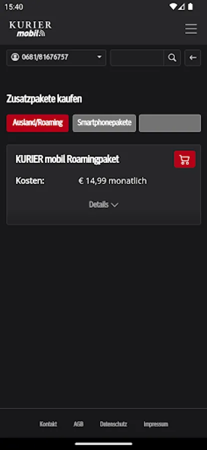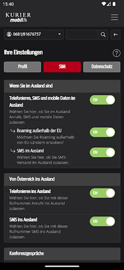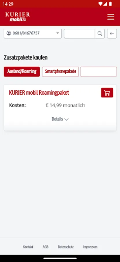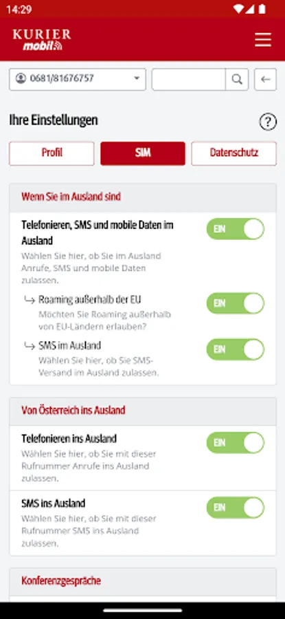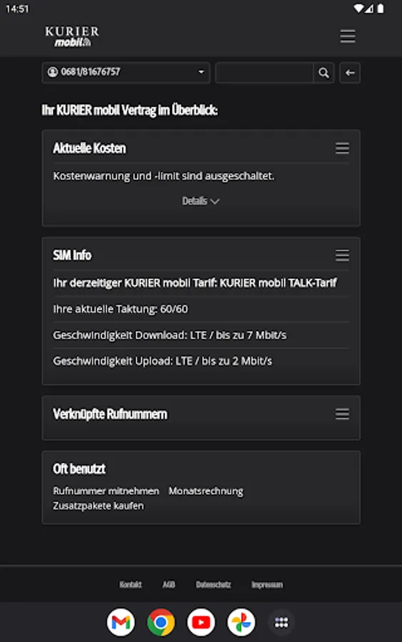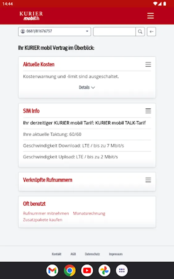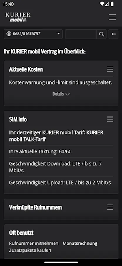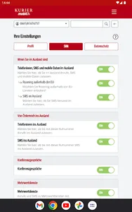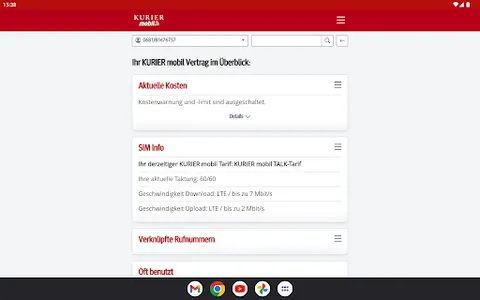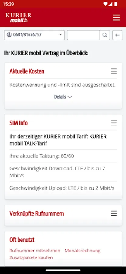 With the free KURIER mobile app, you always have mobile and easy access to the consumption of your included free units, the current cost status and also invoices and itemized bills from the last few months. You will also find information about your contract and can make personal settings. You can optimize your tariff at any time by activating additional packages or upgrading your units.