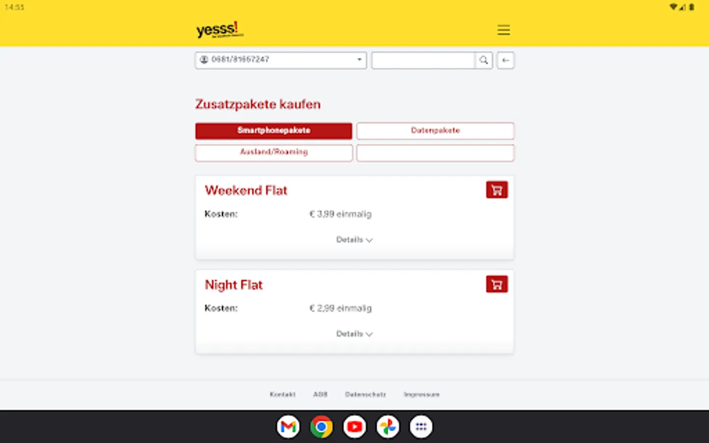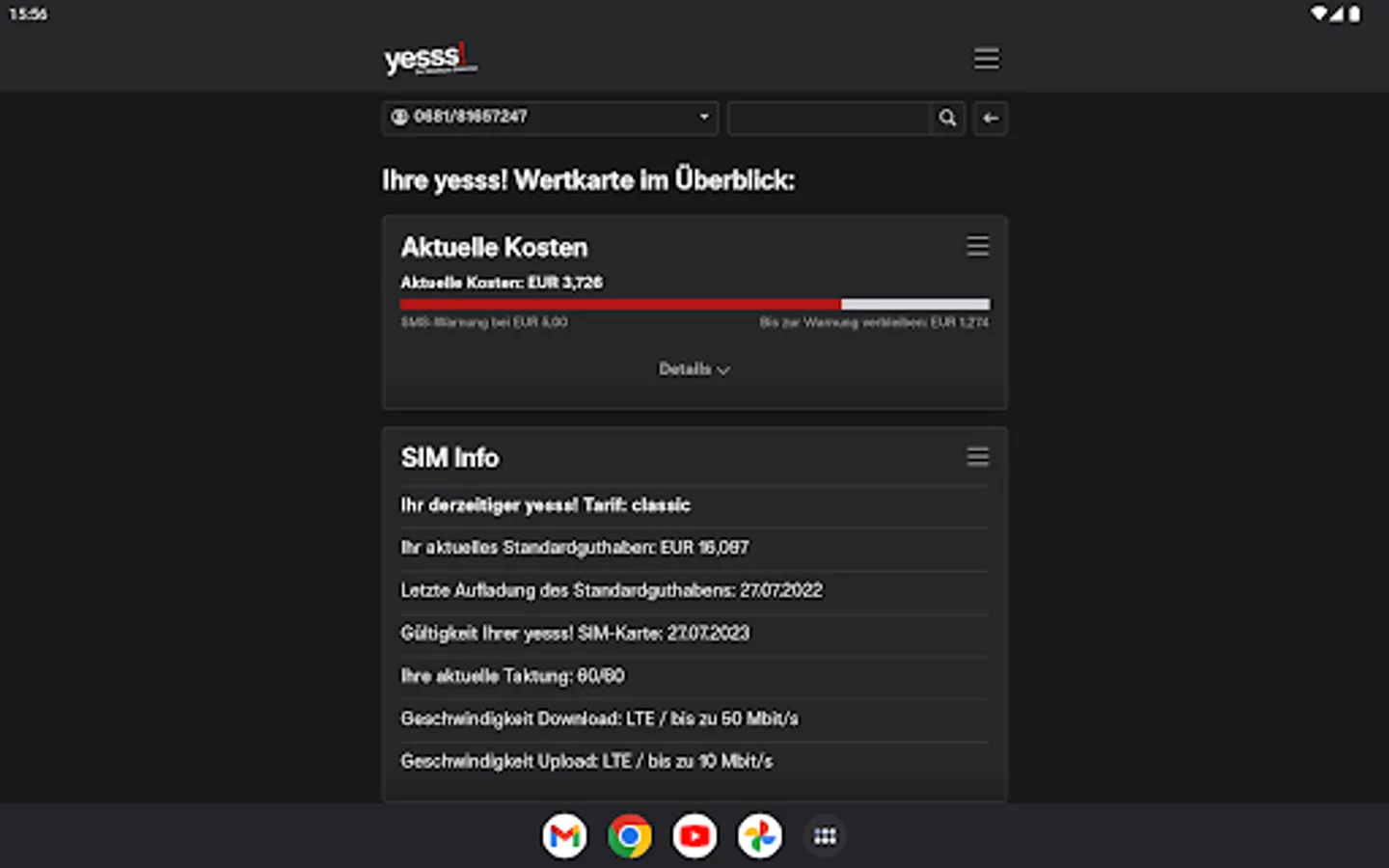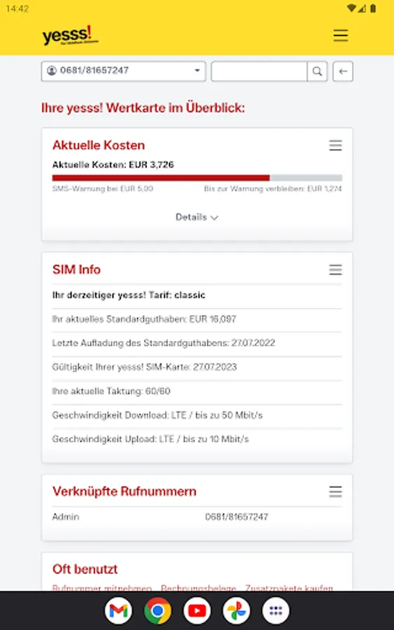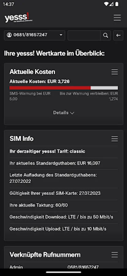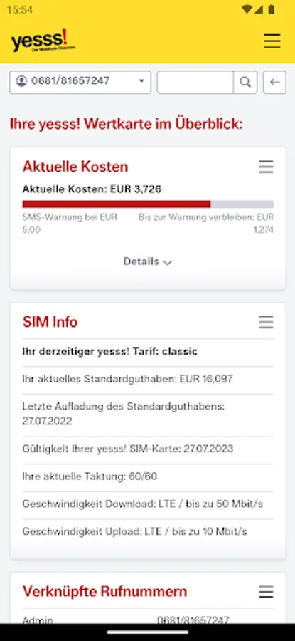 With the yesss! App you have no more stress when surfing and making phone calls! You can see at a glance the consumption of your included free units, the current cost status and also invoices and itemized bills from the last few months. You will also find information about your contract and can make personal settings. You can optimize your tariff at any time by activating additional packages or upgrading your units.