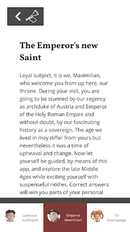 The exhibition enables visitors to experience history, ranging from local conflicts to political decisions concerning the emperor’s realm. The app imparts knowledge in a playful way: it allows users to take on the role of a person who lived in the time of Maximilian I. Rise from beggar to nobleman and attend an audience with the Emperor to receive your personal coat of arms!