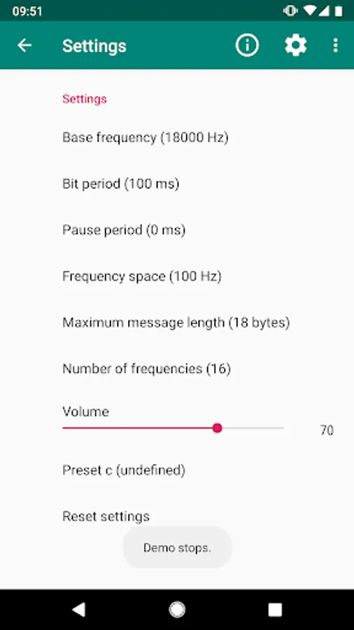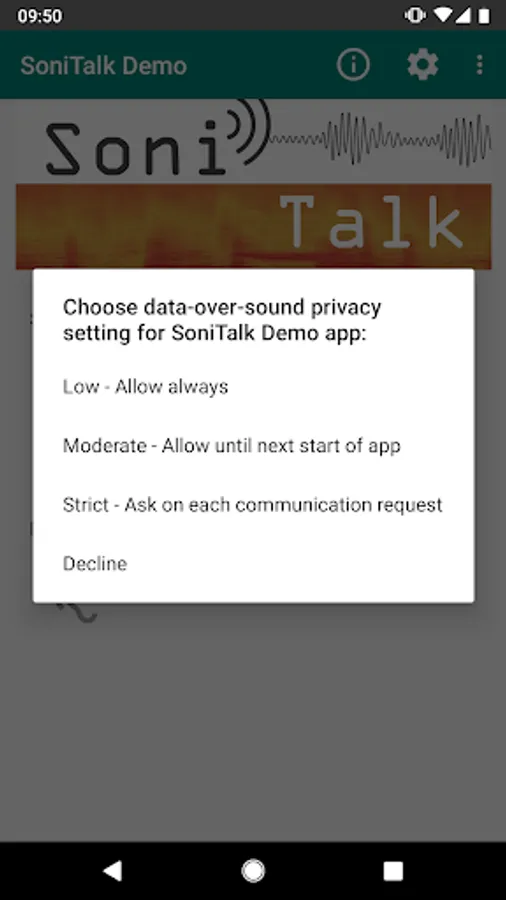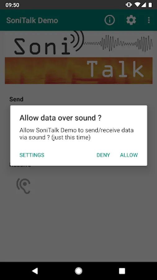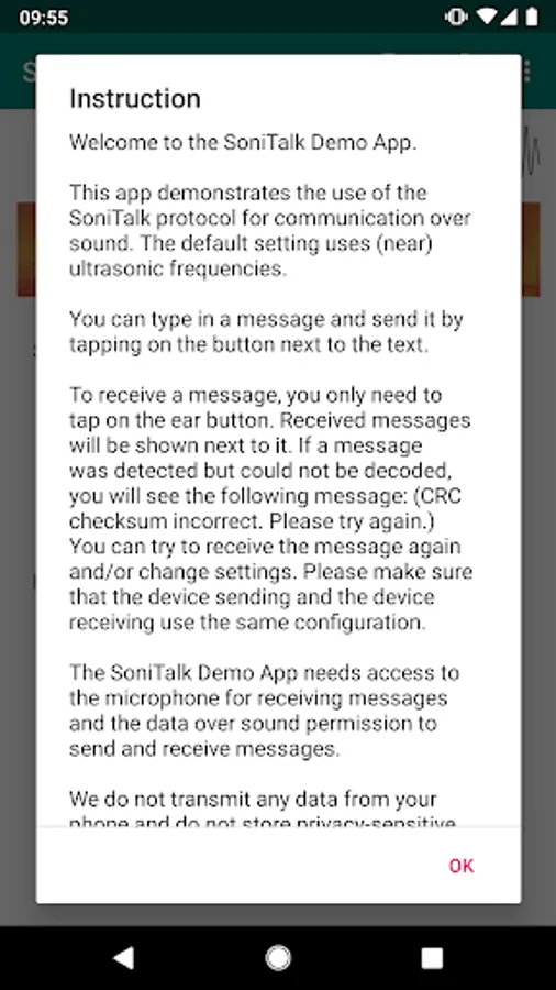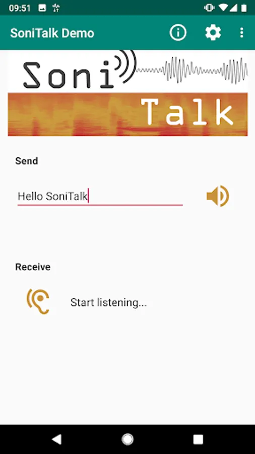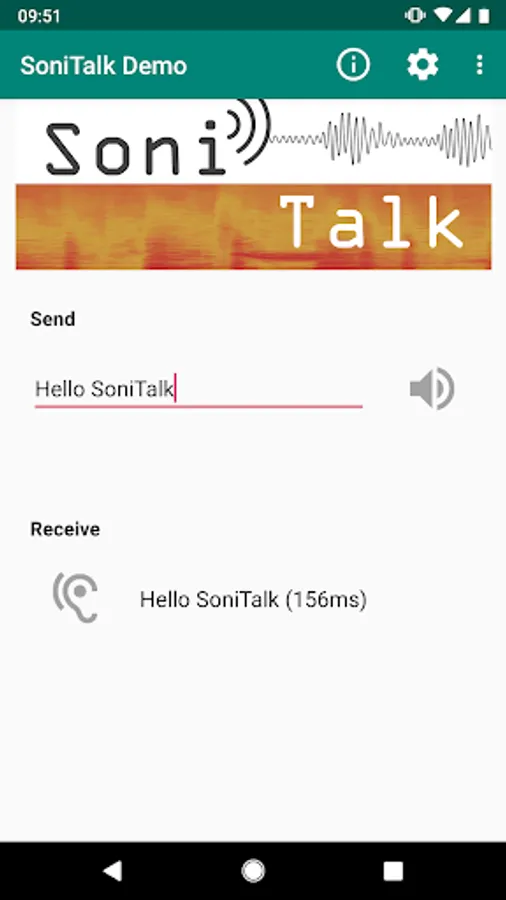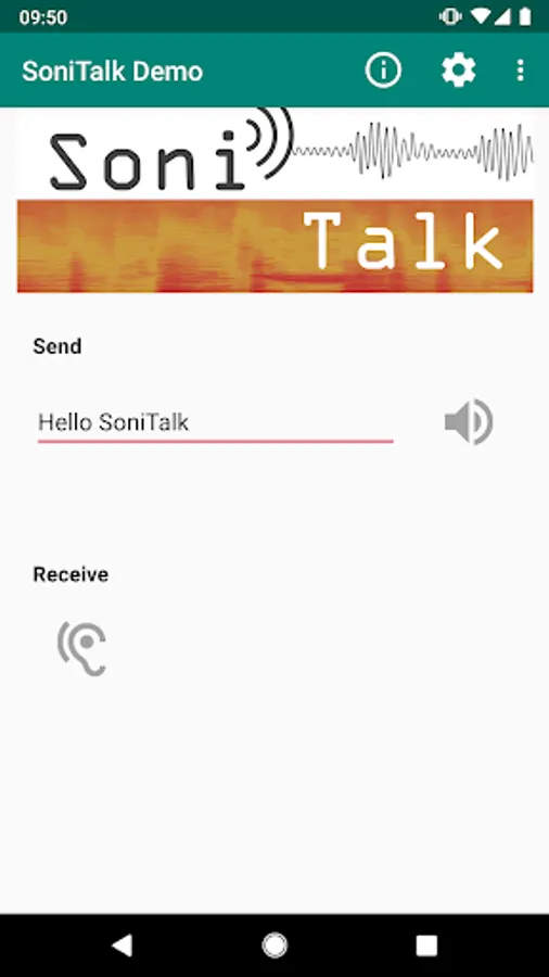 The SoniTalk Demo App demonstrates the use of the SoniTalk SDK for communication over sound. The default setting uses (near) ultrasonic frequencies.