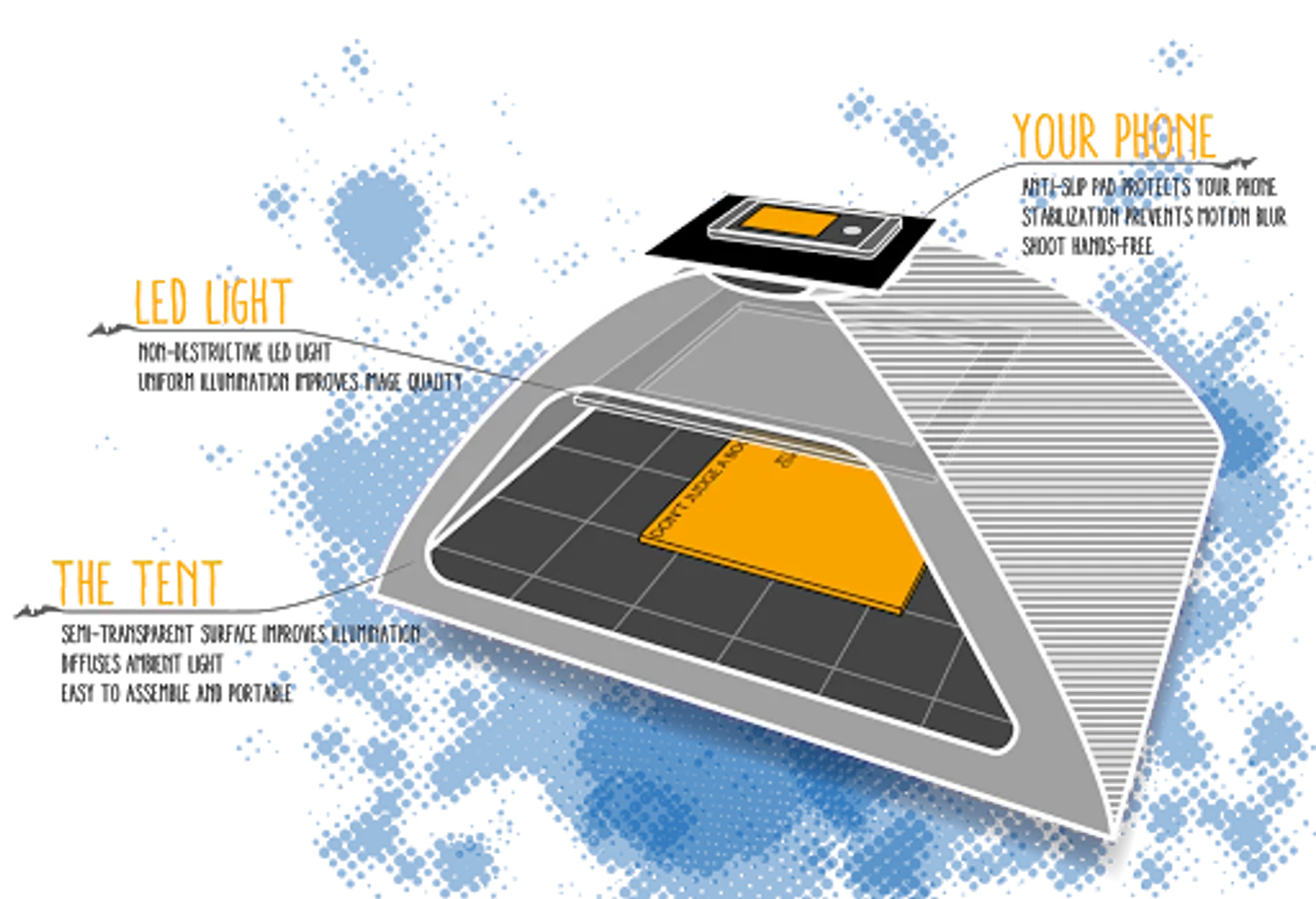 It detects pages in the live preview and makes high quality scans. An automatic series mode takes an image once a page is turned when mounted to the ScanTent. It therefore enables you to scan books or documents quickly without interacting with your mobile.