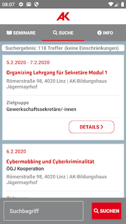 In addition to searching for seminars, the app also offers a practical register with current offers. Interested parties can register immediately and conveniently online.