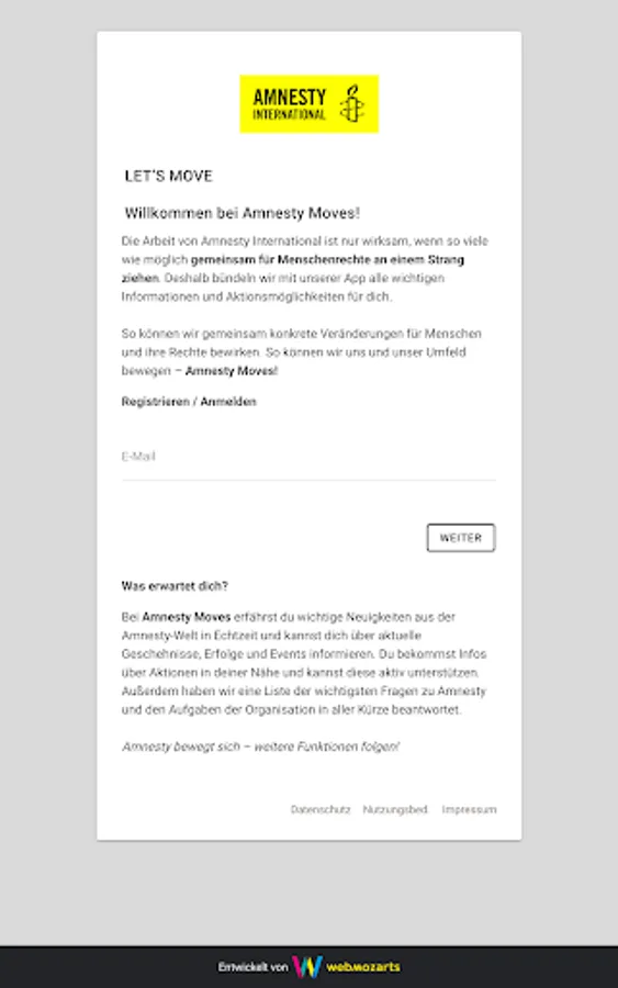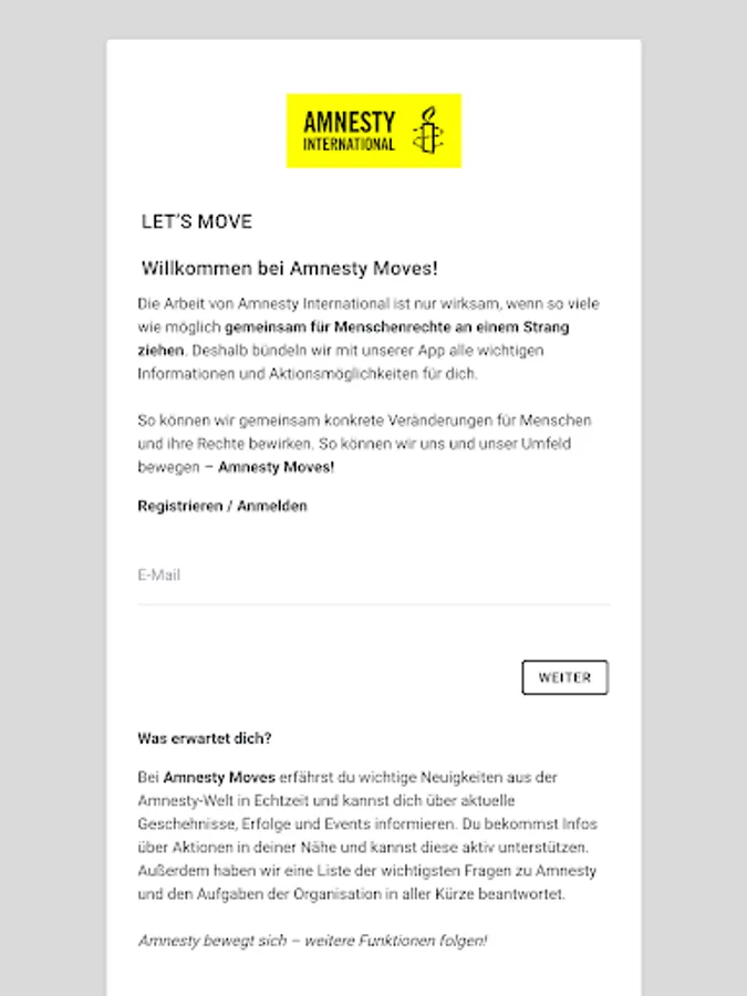 With Amnesty Moves you will find out important news from the Amnesty world in real time and can find out about current happenings, successes and events. You will receive information about campaigns in your area and can actively support them. In addition, we have answered a list of the most important questions about Amnesty and the tasks of the organization in a nutshell.