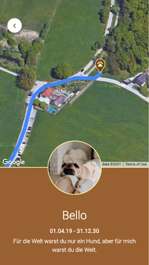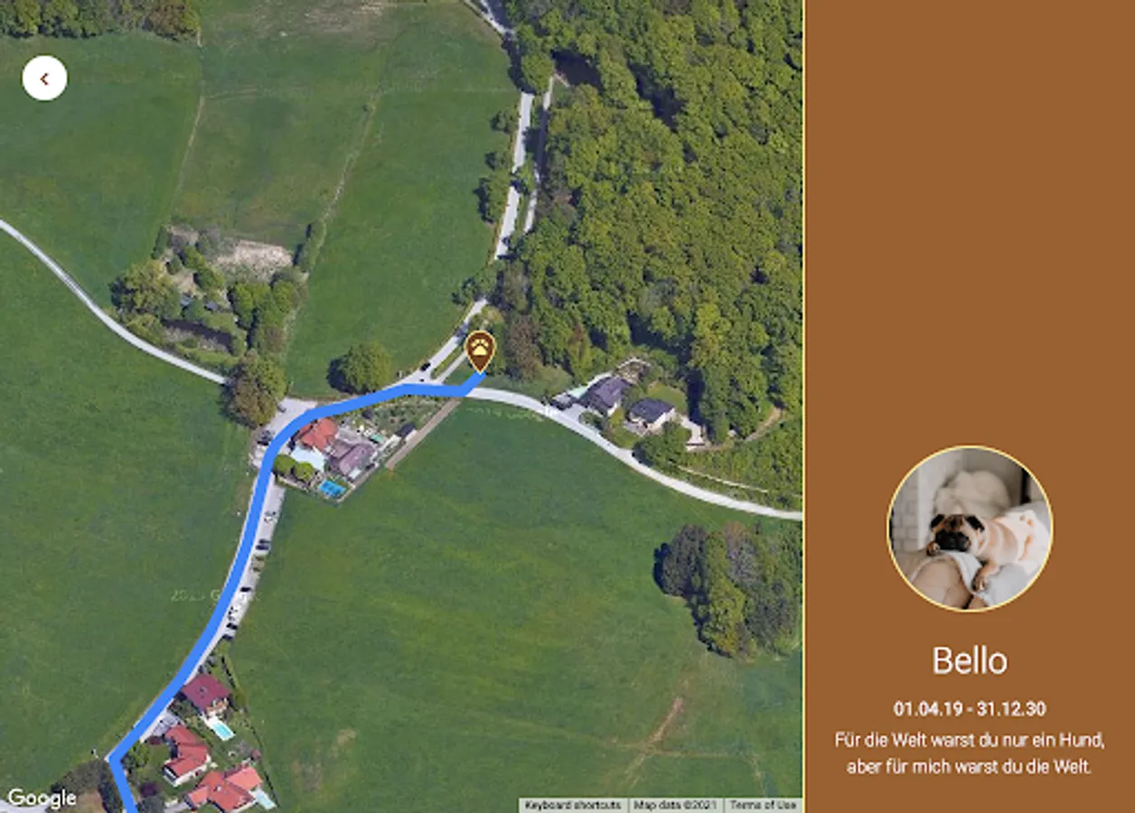 To allow your animal a grave in harmony with nature, this app enables a digital tombstone. In addition to the picture, name, inscription, date of birth and death, the exact location of the grave is marked on a map and a way to get there is shown.