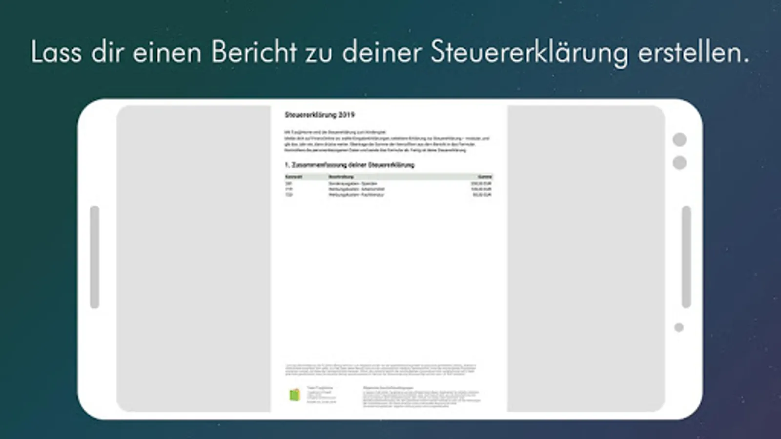 👋 The PDF report for 6.99 euros is an automatically generated report that prepares your information for the tax return. The report explains how to file your tax return. The report contains easy-to-understand instructions for the tax return, a summary of your receipts and what you have to do if the tax office asks.