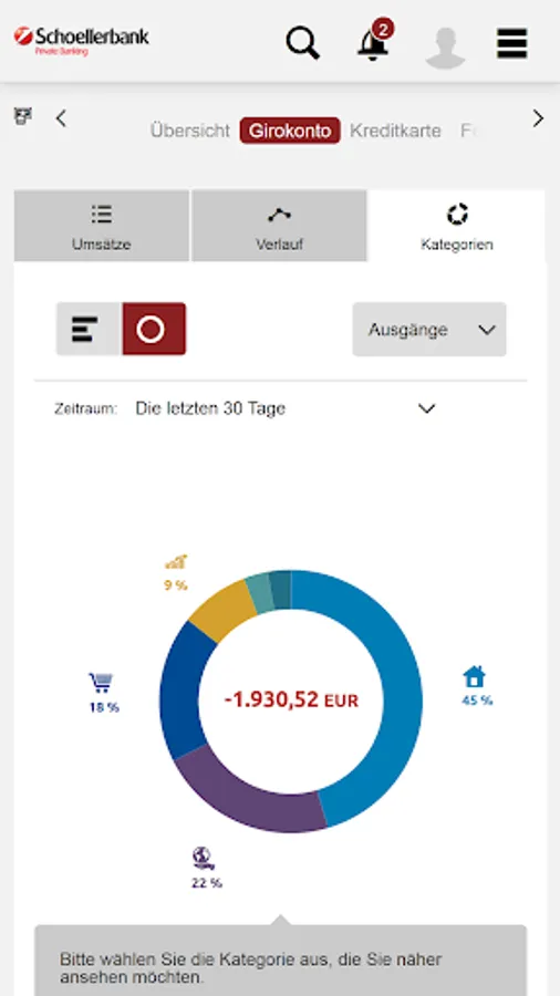 The Personal Finance Manager automatically categorises an account’s incoming and outgoing amounts. This allows the customer to see at a glance what he used his money for and where his income came from. Cash transactions can also be automatically categorised according to certain criteria. Individual rules can be defined if automatic categorisation is not suitable for the customer, and single transactions can be assigned retroactively. Personal Finance Management is a fast and simple way to