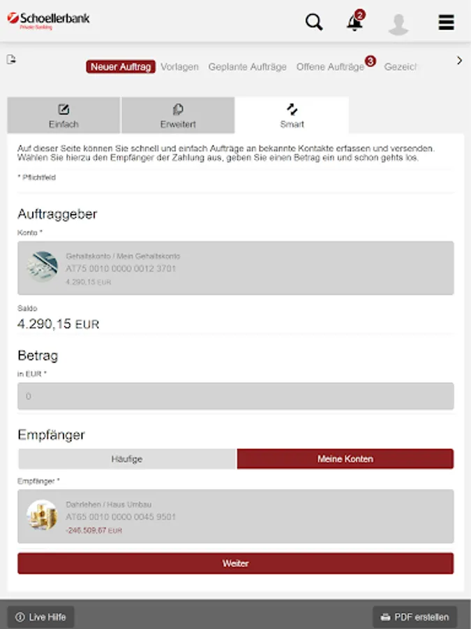 The new online banking app from Schoellerbank also sets new standards for quality and comfort. Security, clarity, and simple menu navigation were factored right into the development of this new generation of online banking tools. In addition to finding information and viewing transactions from your bank accounts and securities accounts, you will discover many new functions that make banking faster and simpler. Transfers can be performed quickly and easily with the drag and drop function. Especially practical: The login can be confirmed by means of a short PIN or fingerprint.