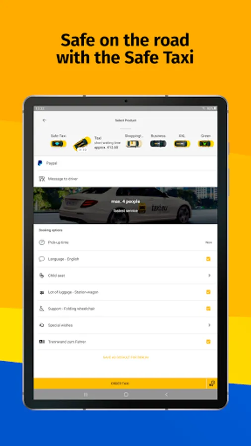 Vehicle types: The next available Taxi, a business Taxi (especially high ride comfort), a safe Taxi (with partition), an XXL Taxi (for 5 to 8 people) or a green taxi(with environmentally friendly Engines).