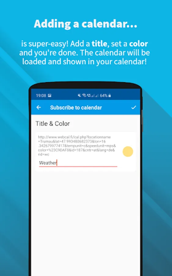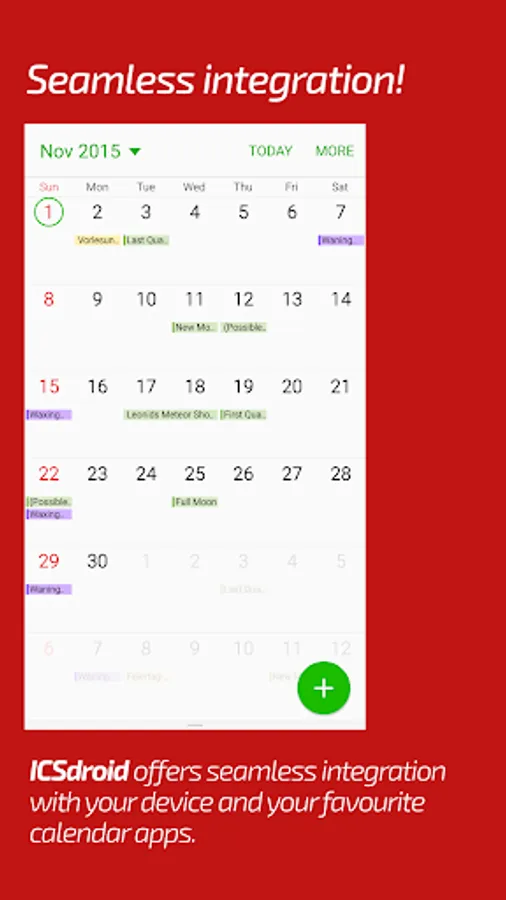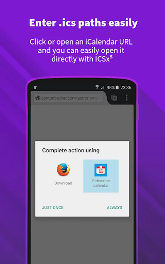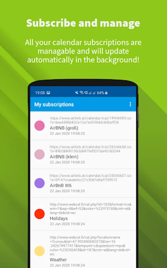 Add high days and holidays, your sports teams events, time tables of your school/university or any other event files that come in ics/ical format. The app will import these events for you and displays it in your favorite calendar app on your Android – it integrates seamlessly into your device. ICSx⁵ uses state-of-the-art technology for synchronization that provides the ability that you always have the most up-to-date version of any added calendar file. All events are perfectly delivered to you devices calendar.